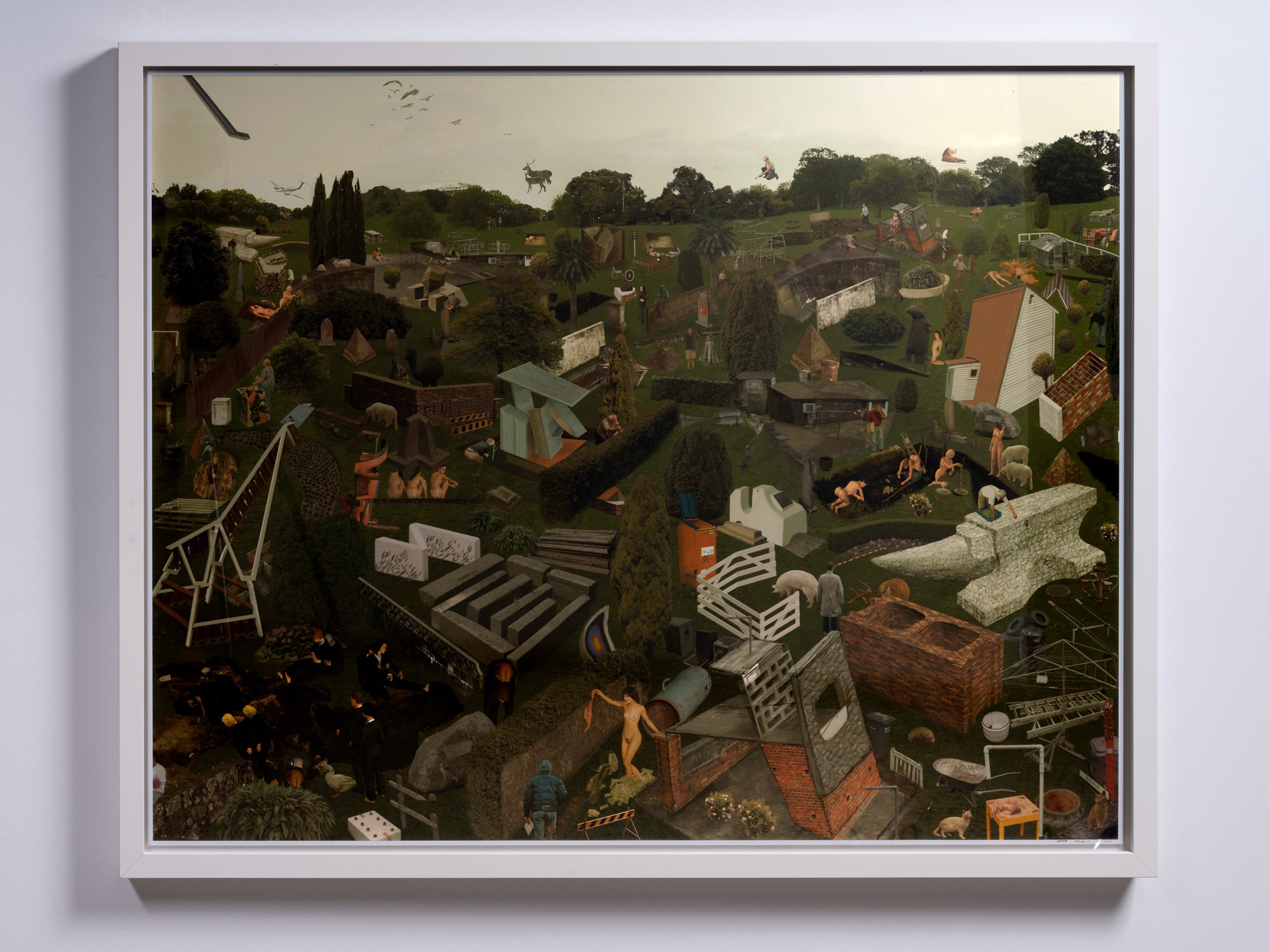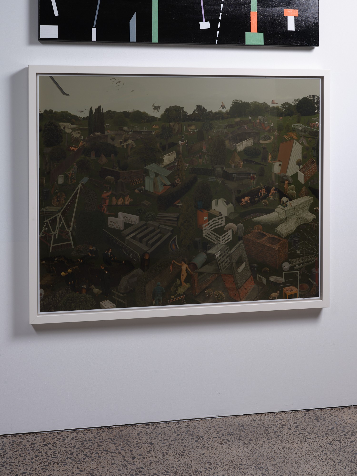 Andrew McLeod’s Parkscape 12 presents an imaginative landscape where classical figures play amongst architectural models. In this Garden of Eden, men in business suits take a break while naked figures labour; a character wearing denim jeans and a puffer jacket meets a woman in classical pose; a pig is herded away from a backyard of industrial detritus. Through this surreal and meticulous garden of pyramids and modernist monuments, Parkscape 12 presents material society as a mythological playground where desire and longing can be explored.
