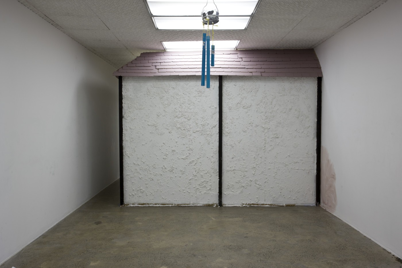 Entering the back gallery there was a small building with a mock-Tudor façade- a facade for a large box constructed from recycled steel insulation panels, the kind that are usually used for walk-in refrigerators. I had found company that would come and erect the structure in a morning. They made it without a door so we cut open a kind of cave entrance at the back, which could be accessed through a narrow corridor. I left the cardboard box for a large electric reciprocating saw, left over from cutting the entrance out in the entry to the space by the facade so you would see the box before the roughly cut out cave entrance. Above it hanging from the ceiling there was a crude, non-functional wind chime, fashioned from plastic broom handles, a kind of pathetic bedraggled- looking thing.