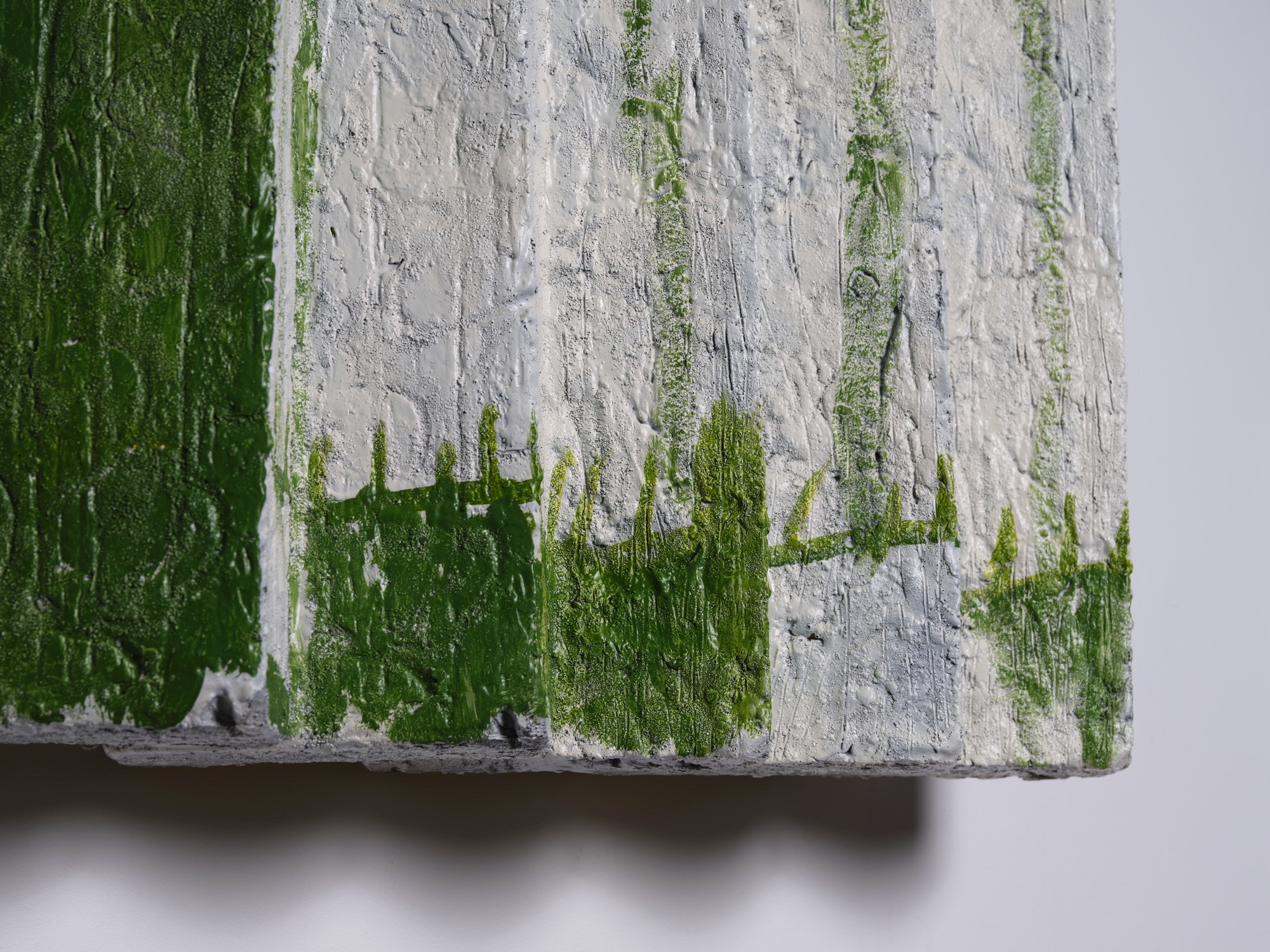 Sleepers (Apples) extends from Dan Arps’ ongoing investigation into the psychological and urban influences of everyday materials, colours and architecture. Inspired by walks down hidden back alleyways and forgotten side-streets, spaces that digital mapping might miss, Sleepers (Apples) resembles a fragment of a fence, neglected with moss encroaching. The fragment is familiar and nostalgic, and plays with the formal constraints of Minimalism to consider the language of fencing structures. Sleepers (Apples) isolates selected geometries, textures and colours of the fence and mounts them on the wall, questioning its legitimacy as a marker of property, privacy, security and separation within a supposedly free and natural world.