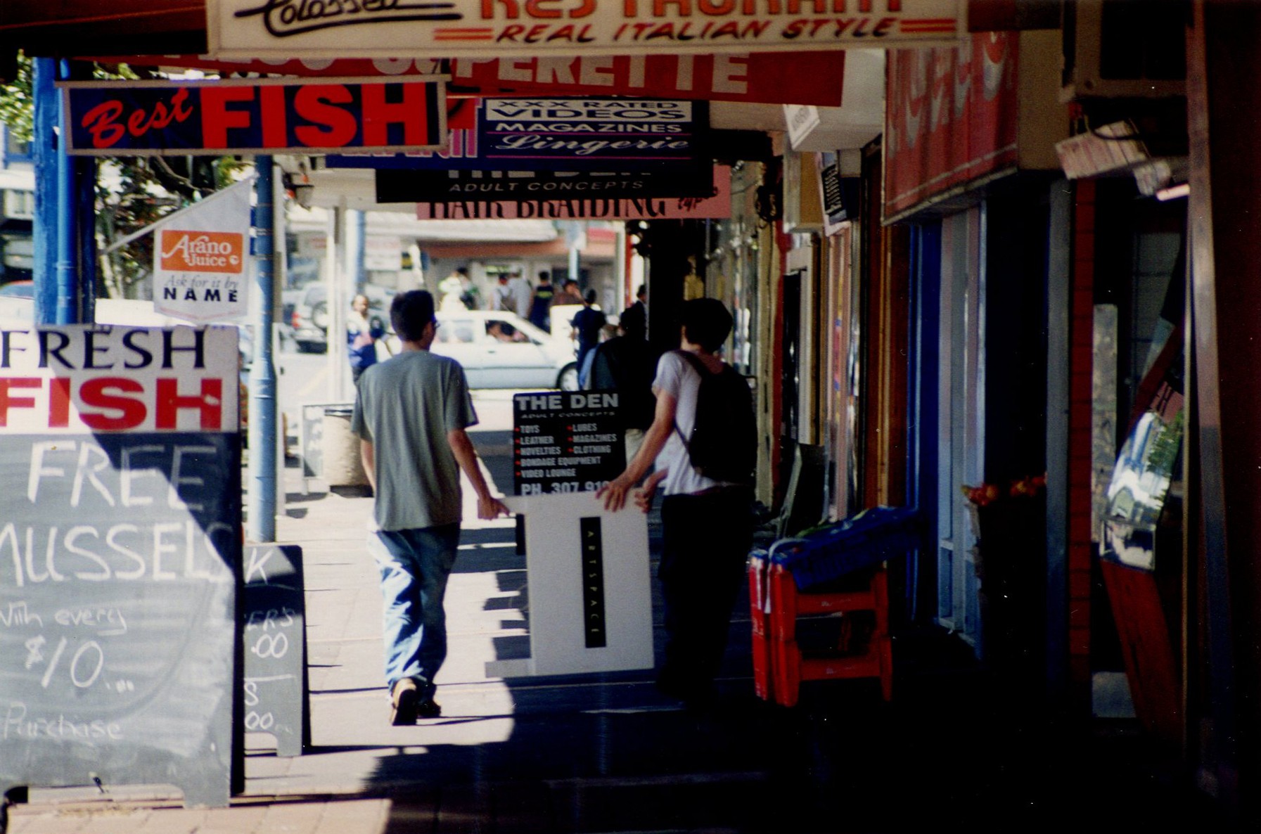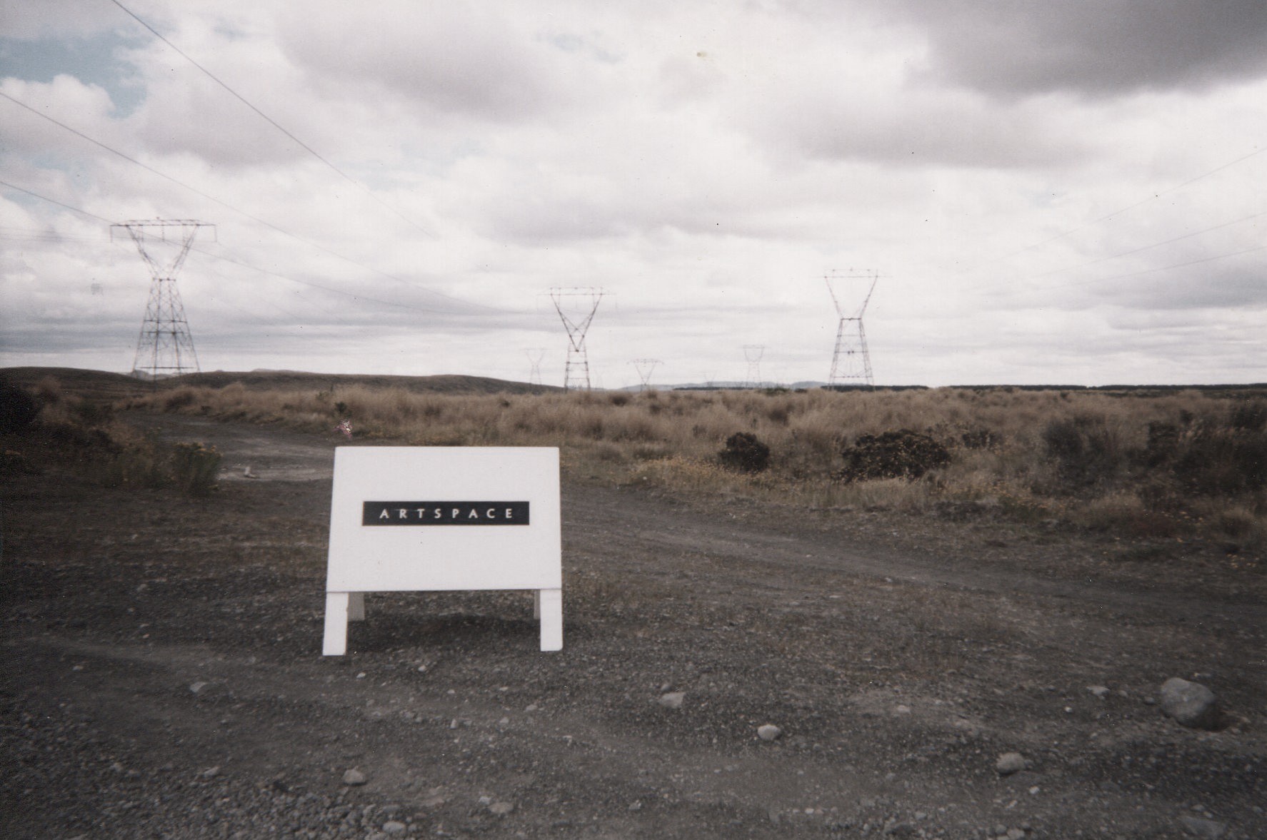 Photograph documenting the theft and travels of Artspace’s sandwich board in 1998, courtesy of Dane Mitchell
