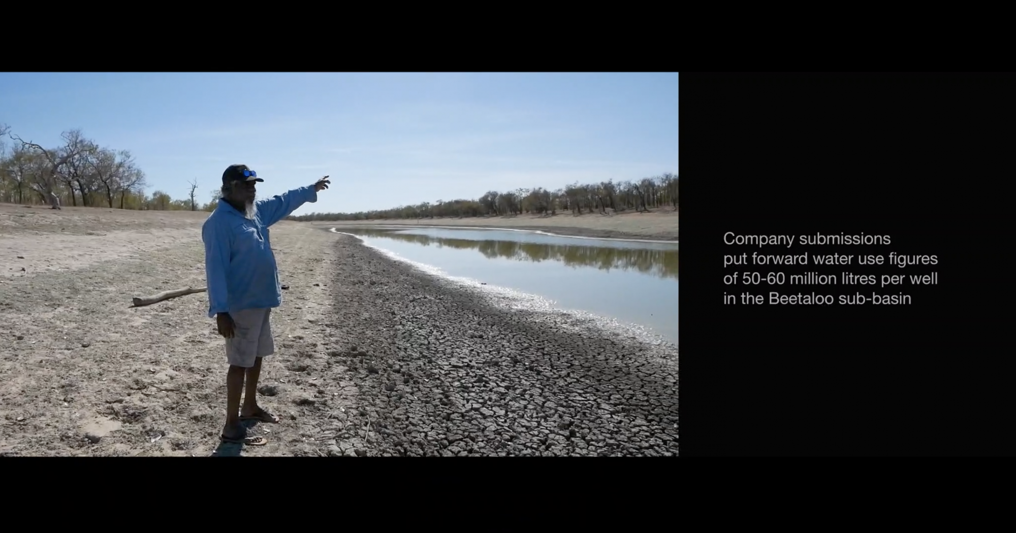 Artist and former water bore runner Dimakarri ‘Ray’ Dixon (Mudburra), points to existing and prospective wells upstream of Lake Woods and Newcastle Waters, an important gathering ground, historic also for 1966 pastoral industry walkoffs.
