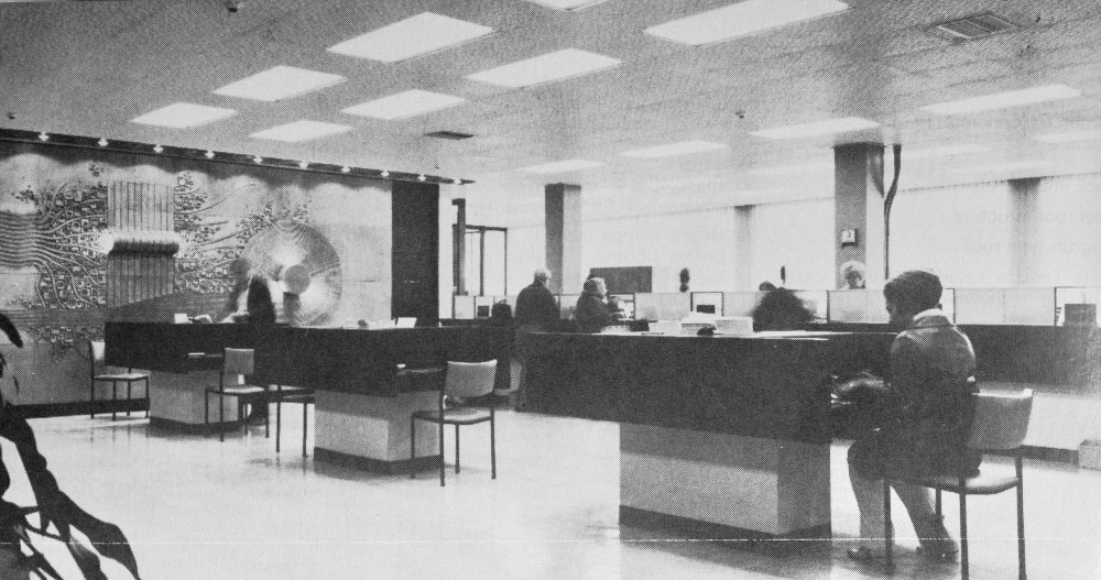 Public area showing Guy Ngan mural along the back Wall, Newton Post office, 1973. Image Copyright to The New Zealand Institute of Architects.