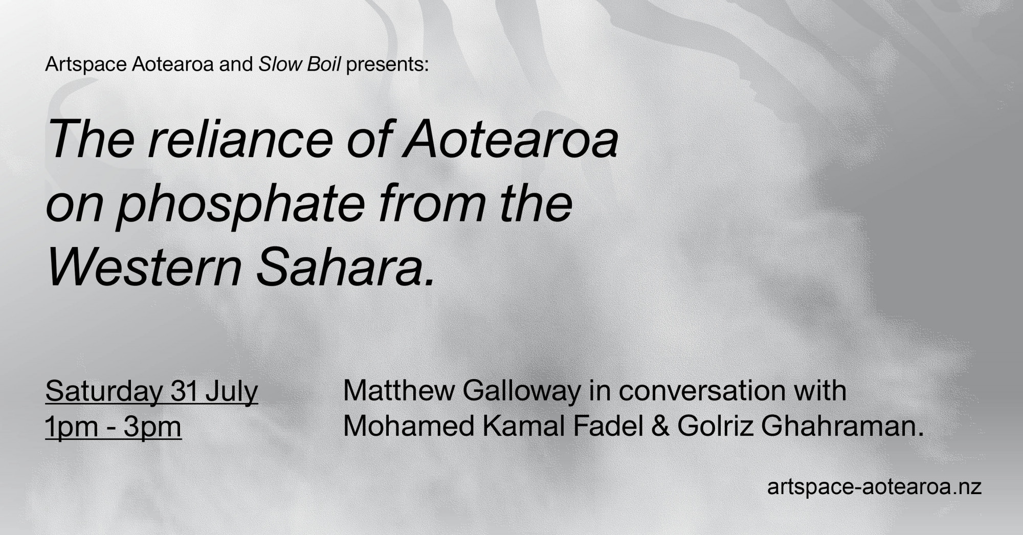 Artspace Aotearoa and Slow Boil presents, The reliance of Aotearoa on phosphate from the Western Sahara. This panel discussion features Matthew Galloway in conversation with Mohamed Kamal Fadel & Golriz Ghahraman, the speakers will be extending the research & work produced over the course of Slow Boil, and within the context of examining what the sharing of kai can do to transform how we conceive of knowledge, resilience & mana motuhake.