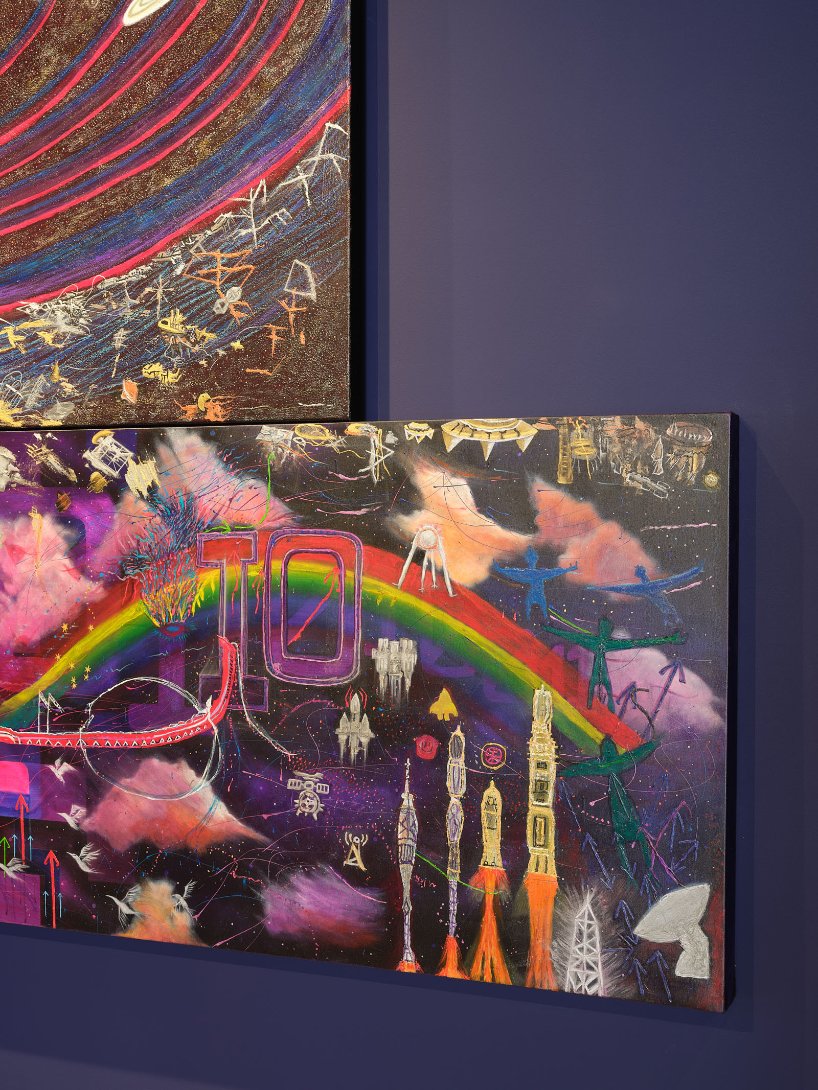 Emily Karaka, Mauna Loa, 2024, mixed media on canvas, 1950 x 1960 mm; Kī lauea, 2024, mixed media on canvas, 2035 x 1960 mm.
