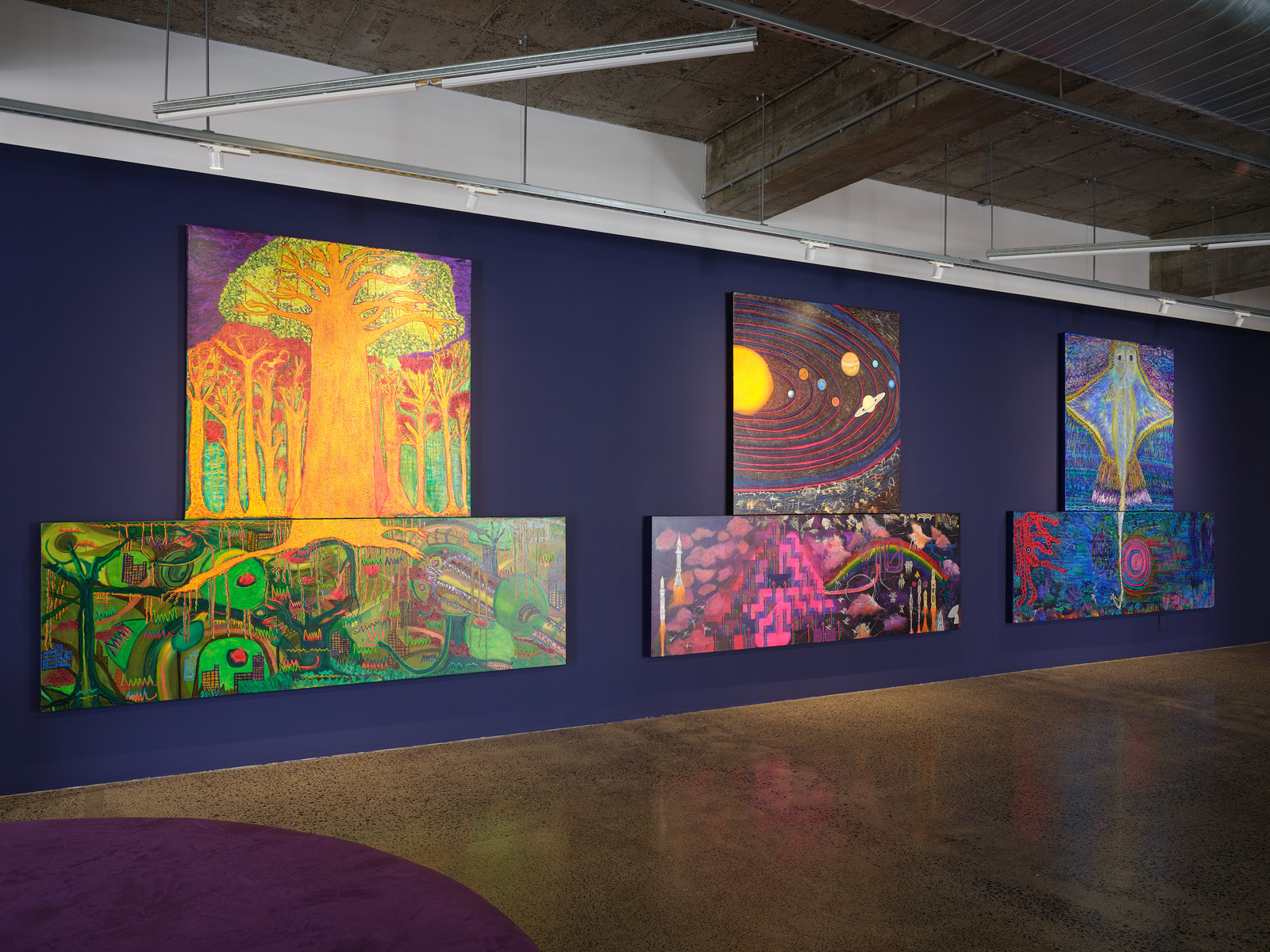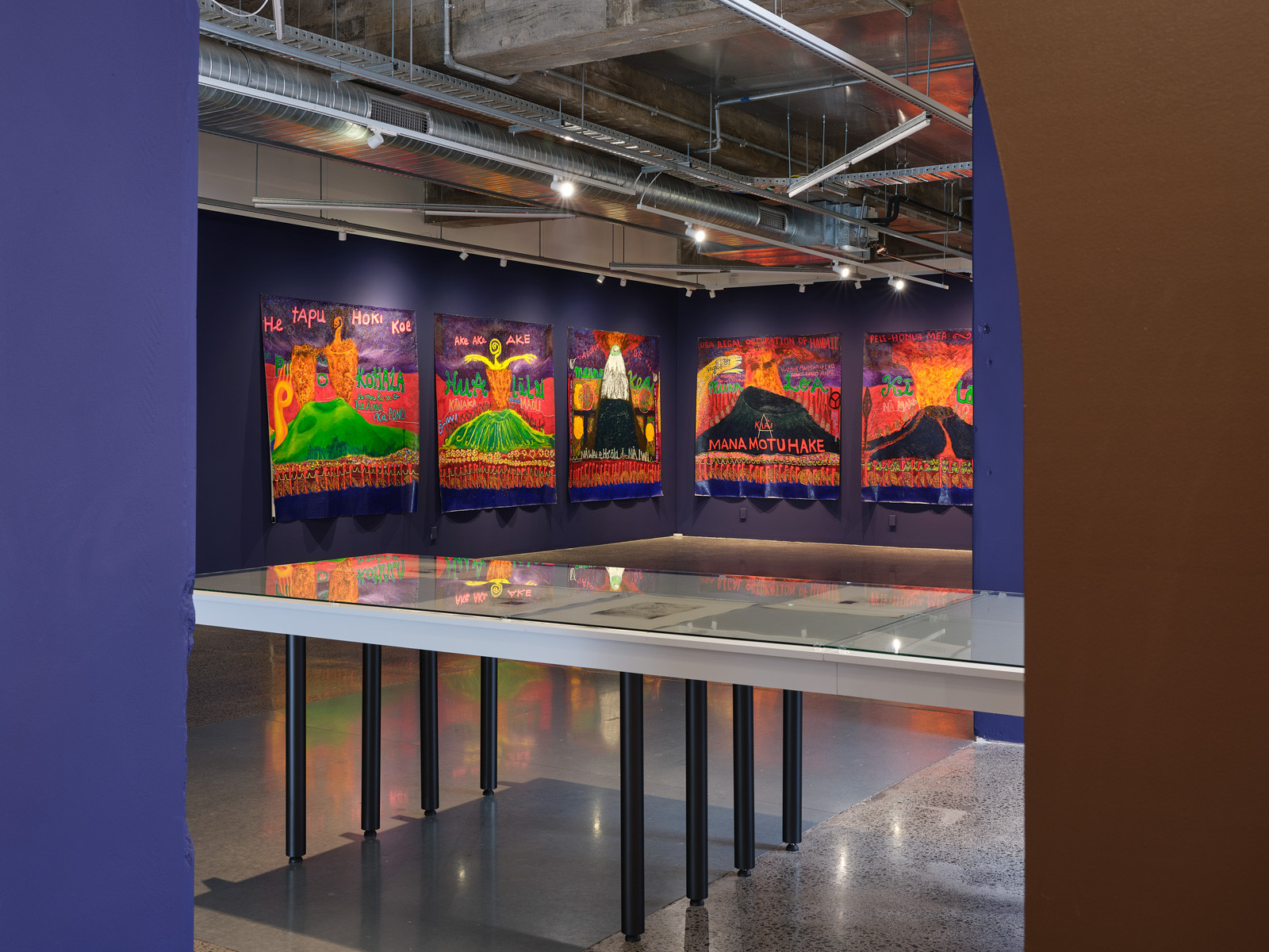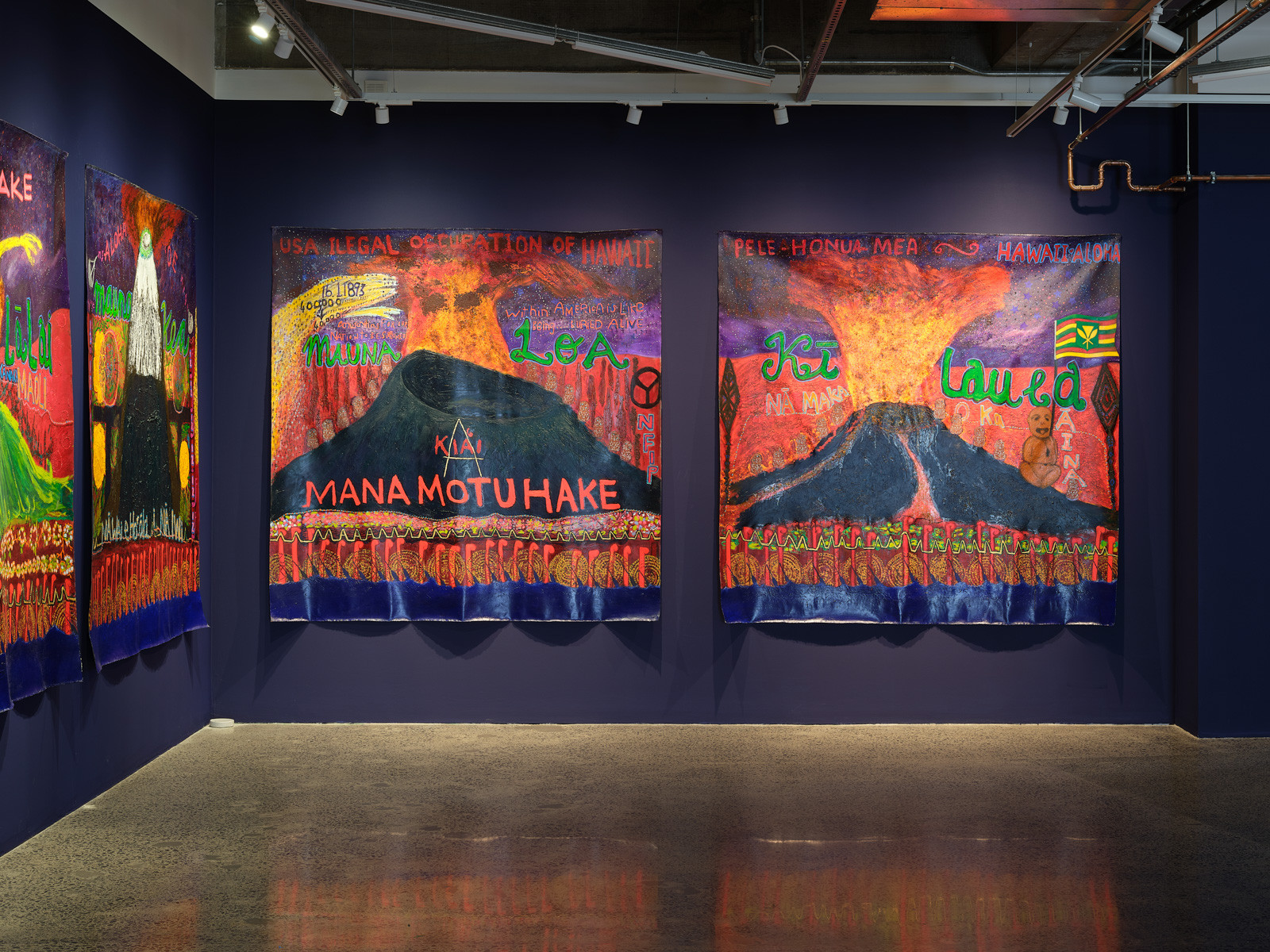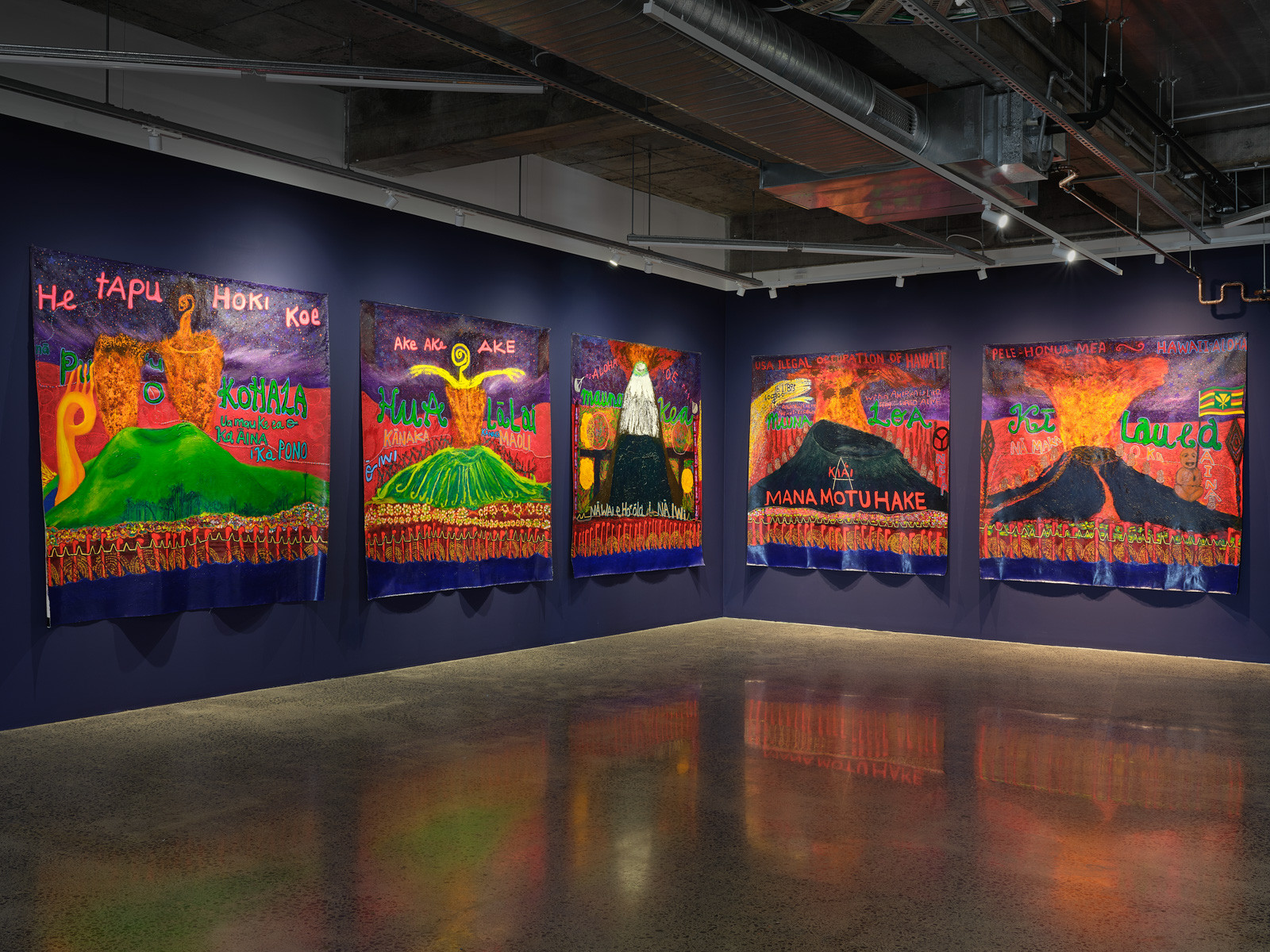 Emily Karaka, Kohala 1, 2024, mixed media on canvas, 1950 x 1960 mm; Hualālai, 2024, mixed media on canvas, 1950 x 1960 mm; Mauna Kea, 2024, mixed media on canvas, 1950 x 1960 mm; Mauna Loa, 2024, mixed media on canvas, 1950 x 1960 mm; Kī lauea, 2024, mixed media on canvas, 2035 x 1960 mm.