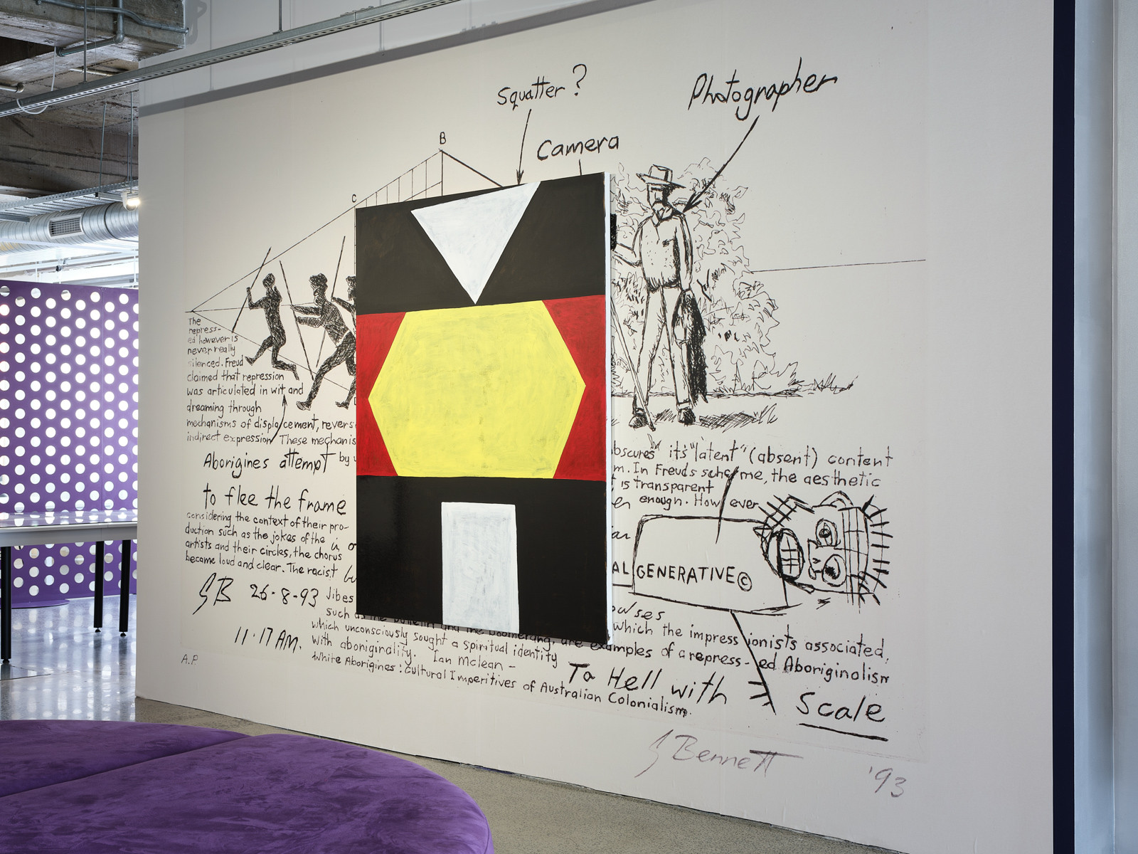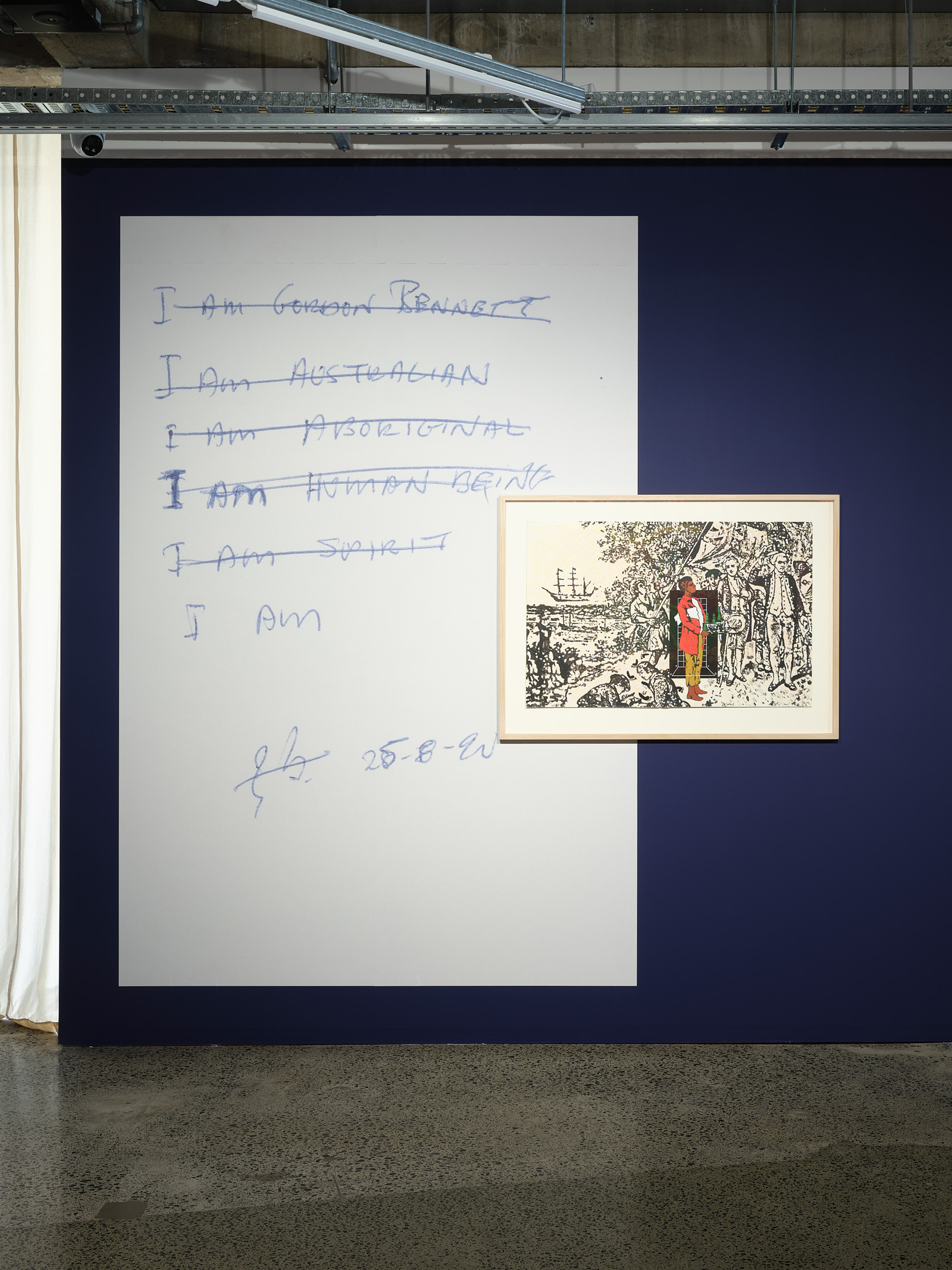 Gordon Bennett, Study for Possession Island, 1991, oil, synthetic polymer paint and gouache on illustration board, 650 x 1000 mm (board), 840 x 1150 mm (frame); I am Gordon Bennett, 1990, archival document enlarged as custom made vinyl stickers, originals, 140 x 100 mm.