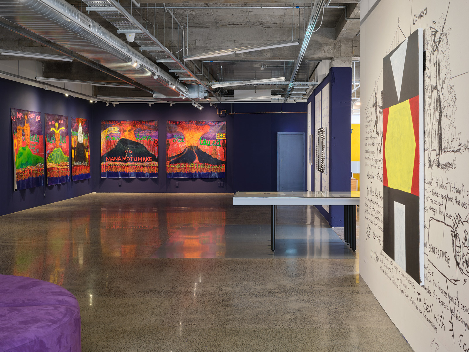 Emily Karaka’s vibrant paintings have a pulse. Unashamedly she is an abstract expressionist, largely self-taught. She powerfully activates, line, colour, and language. Like the isthmus Tāmaki Makaurau, Karaka’s current deviates from standard temporal delineations as she engages with kōrero from her tupuna, from today, and tomorrow. As an artist-activist Karaka describes her work as political landscapes. The artworks in the exhibition insert an Indigenous, full body analysis into the subject within the frame. The Hawai’i suite originally commissioned for Hawai’i Contemporary 2025 displays her dedication to sovereignty and the role that primary sacred sites play within her practice. LAW A? (2026), commissioned for this exhibition, takes the basic requirement for survival—land, air, water—as its starting point. Karaka scrutinises the conglomerate agency LAWA (Land, Air, Water Aotearoa), made up of various council, government, education, science, and private sector groups that measure the health of these resources. While the data may be practically useful, it is notable that a Māori voice is not visible. She subtly draws our attention to the way kaitiakitanga plays out in the current environment where transparency around participation and knowledge sharing is more urgent than ever.