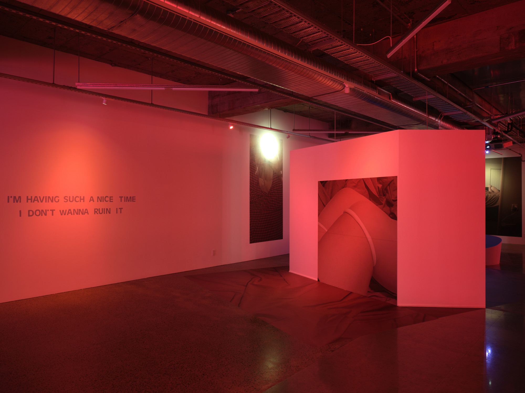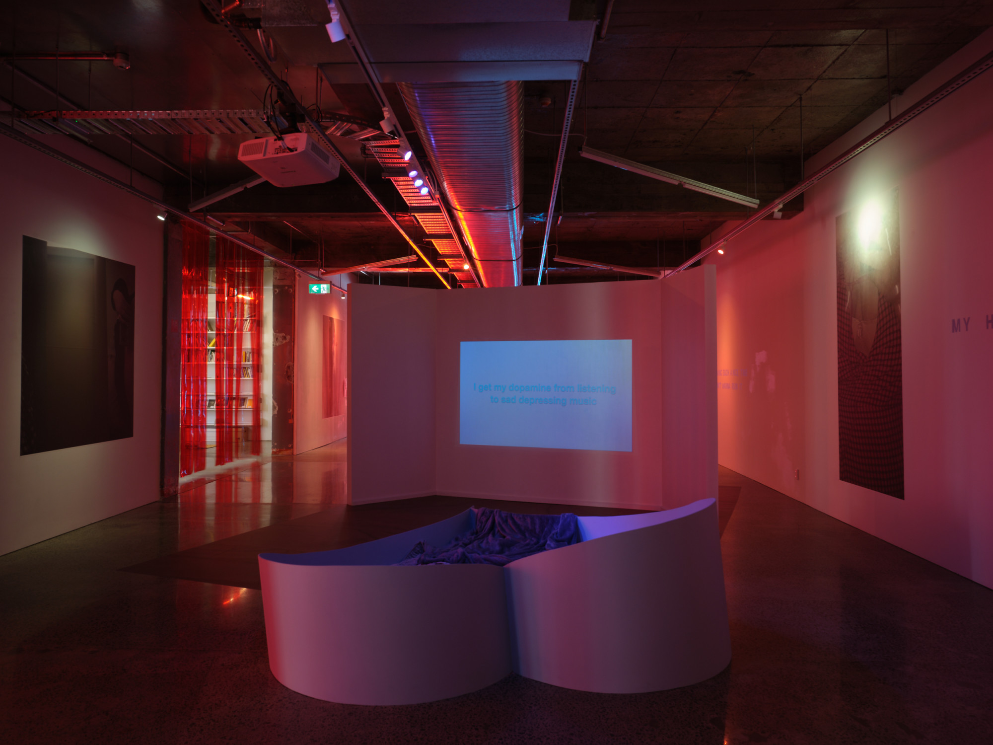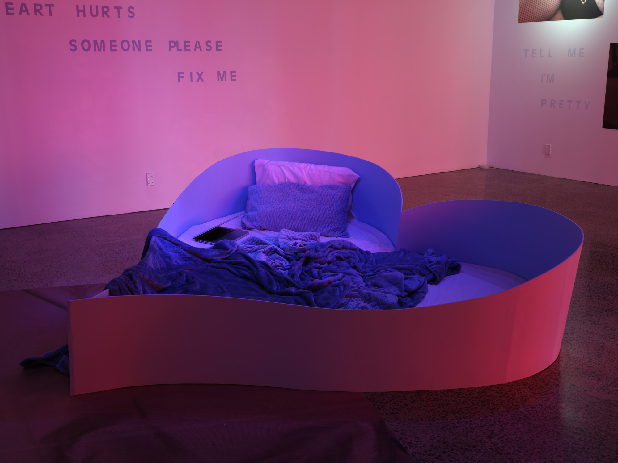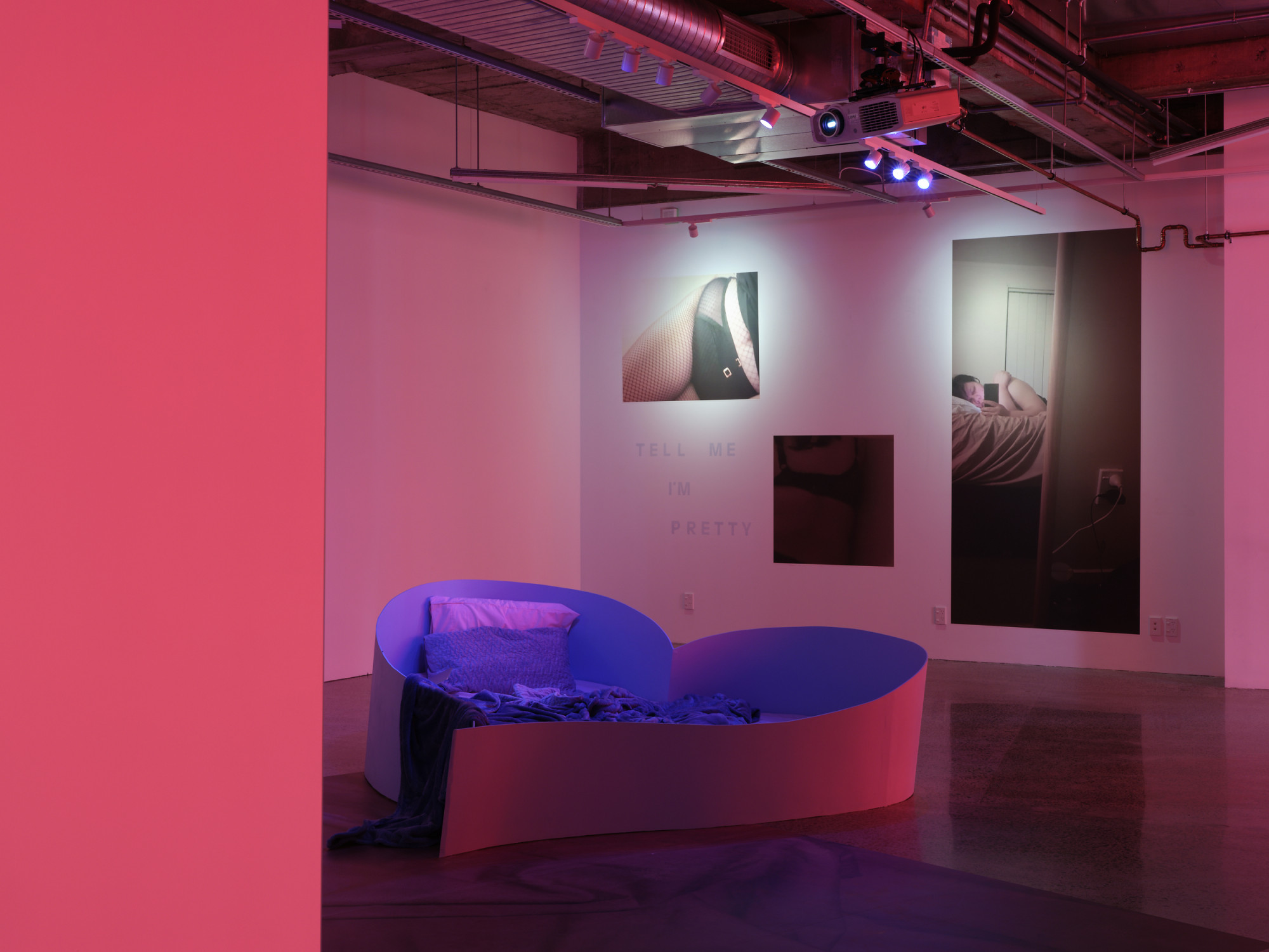 Artspace Aotearoa is delighted to present I Think You Like Me, But I’ve Been Wrong About These Things Before, the first major solo show by Tāmaki Makaurau based artist Natasha Matila-Smith, an exhibition installation in which the gallery presents itself as a sort of meta-space, through the intentional employment of obvious conceptual metaphors connected to the bedroom. The gallery exists as a parallel universe of the artist’s bedroom. A space in which for the artist, exists as both a psychological extension and material manifestation of her empirical reality with romance, sexual intimacy, and social anxiety.