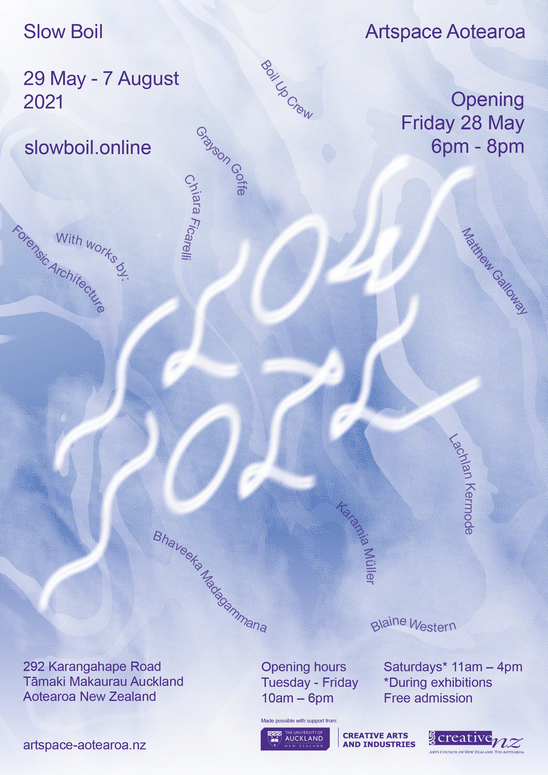 Throughout the course of the exhibition, Slow Boil organises free and open to all screenings and seminars from July onwards, these events will be announced upon the opening of the exhibition, all reading through the concept of ‘slow violence’ and its potential for resistance in both Aotearoa New Zealand and the world.