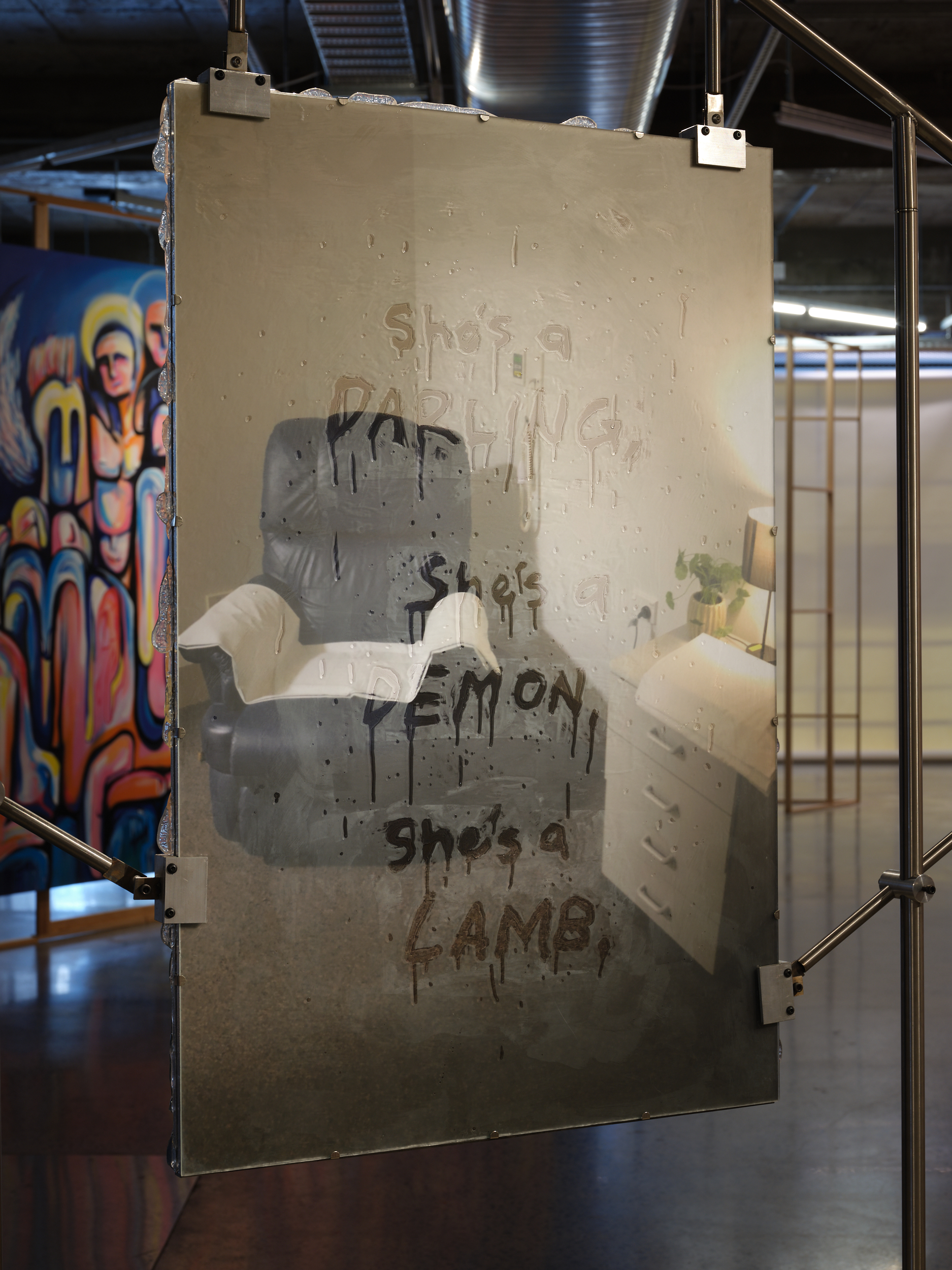 AA: What were you hoping to communicate in your work that has ‘she’s a darling, she’s a demon she’s a lamb’ inscribed onto it?