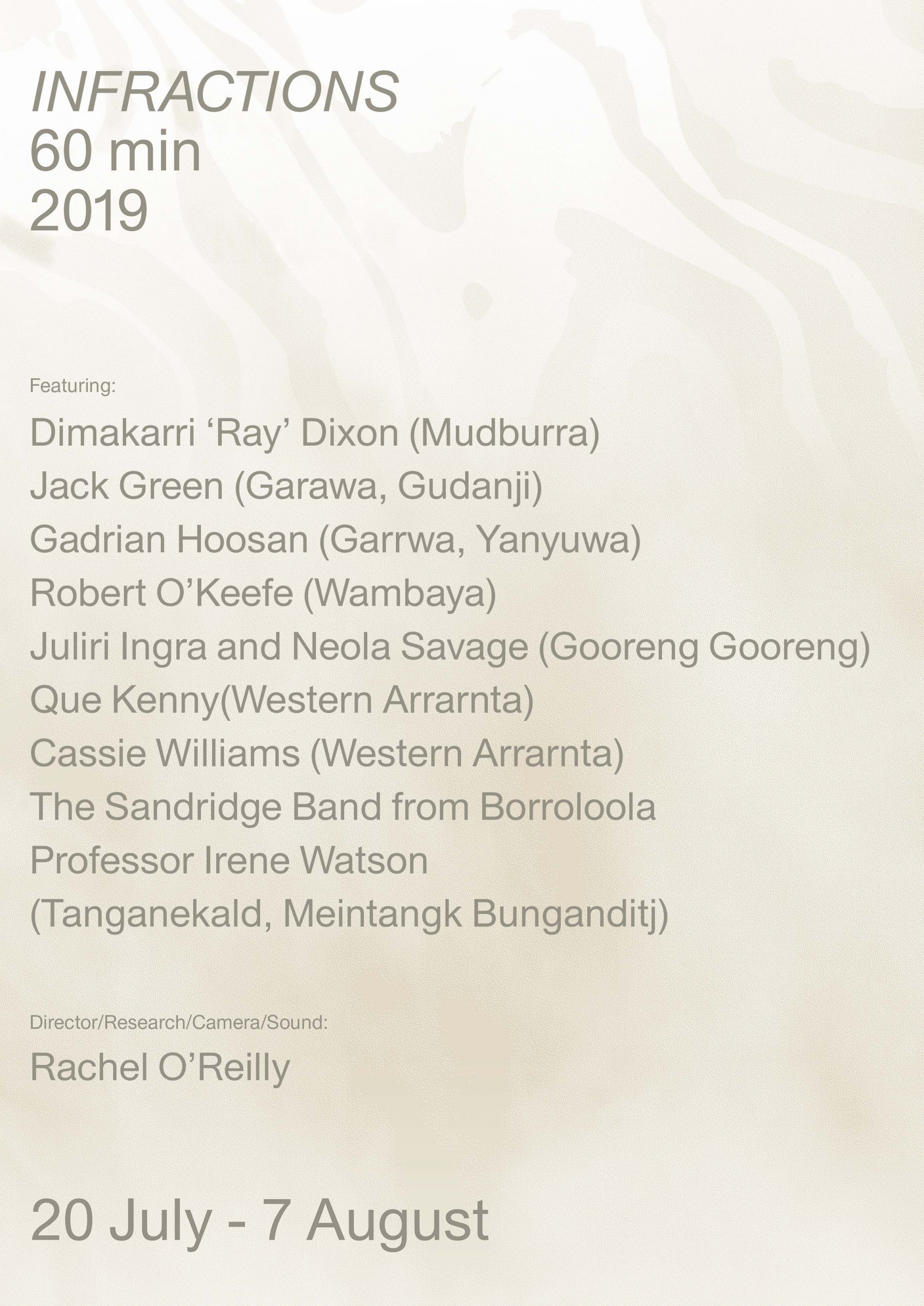 Refuting capitalist and colonial models of land and water in the driest continent on earth, INFRACTIONS features musician/community leader Dimakarri ‘Ray’ Dixon (Mudburra); two-time Telstra Award finalist Jack Green, who is also winner of the the 2015 Peter Rawlinson Conservation Award (Garawa, Gudanji); musician/community leader Gadrian Hoosan (Garrwa, Yanyuwa); ranger Robert O’Keefe(Wambaya); educators Juliri Ingra and Neola Savage (Gooreng Gooreng); Ntaria community worker and law student Que Kenny(Western Arrarnta); musician Cassie Williams (Western Arrarnta); the Sandridge Band from Borroloola; and Professor Irene Watson(Tanganekald, Meintangk Bunganditj) contributor to the draft UN Declaration on the Rights of Indigenous Peoples, 1990-1994.