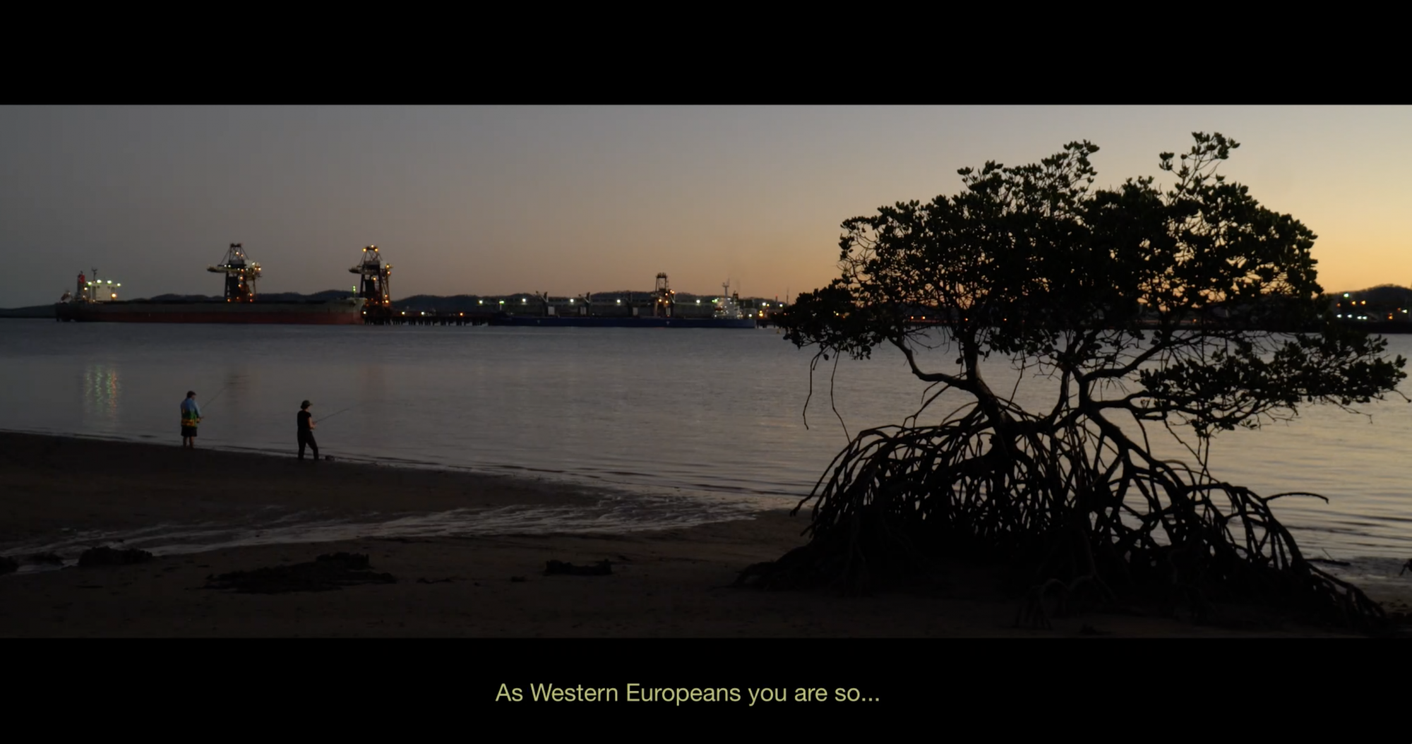 Settlers fishing on Gooreng Gooreng country, Yallarm (Gladstone harbour). Voiceover, Professor Irene Watson: