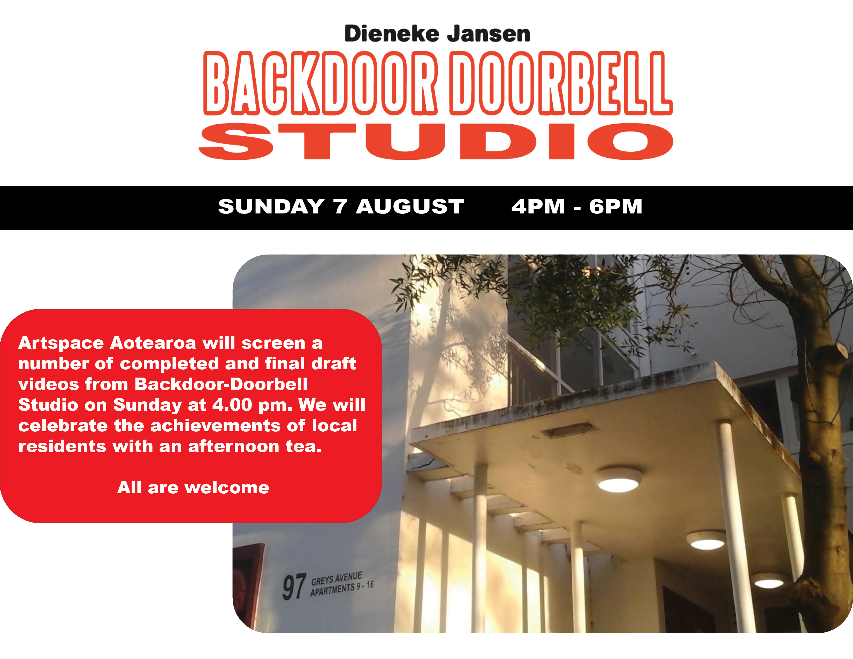 Throughout June and July, Artspace Aotearoa hosted Backdoor-Doorbell Studio by Dieneke Jansen, a film-making studio enabling groups of local residents to create video works collaboratively. While the workshops themselves are valued in an art practice that frames process as an outcome, they also aim to make possible an experience of satisfaction and pride in creating and publicly sharing self-representations and expressions.