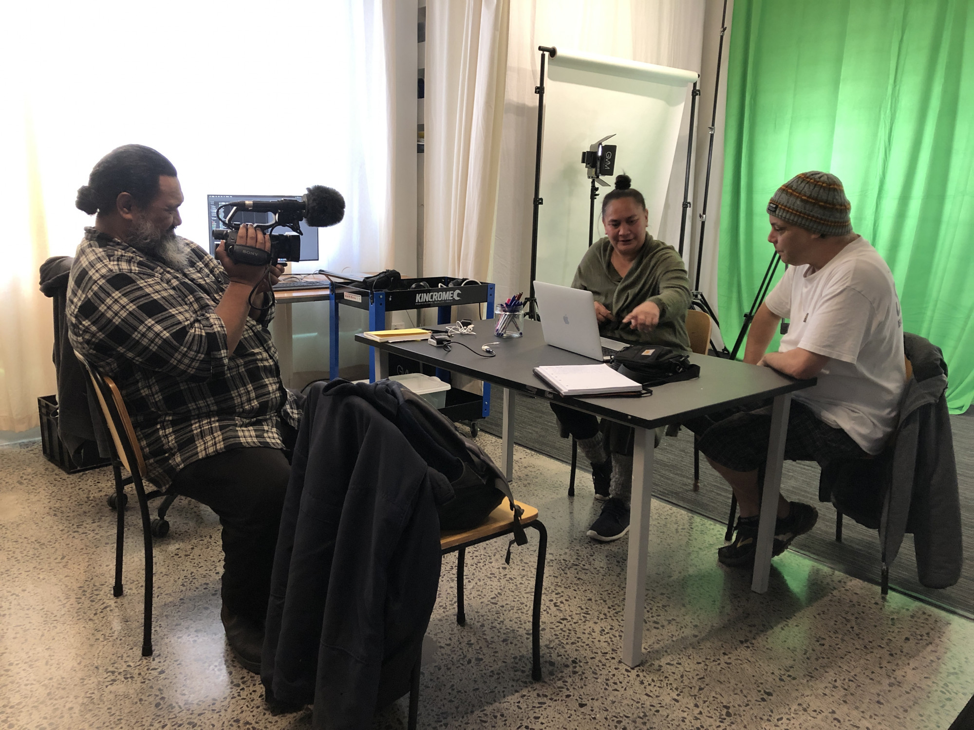 Great conversation often occurs while people are doing things together. Backdoor-Doorbell Studio establishes its kaupapa from conversational dialogue that intuitively develops. Through hands-on making and by demystifying technical film processes, from camera work to editing, Backdoor-Doorbell Studio embraces the shared knowledge brought to the studio space. In many ways this active co-learning may be a portal to dialogue that affirms knowledge, lived experiences, and perceives reality as a process.
