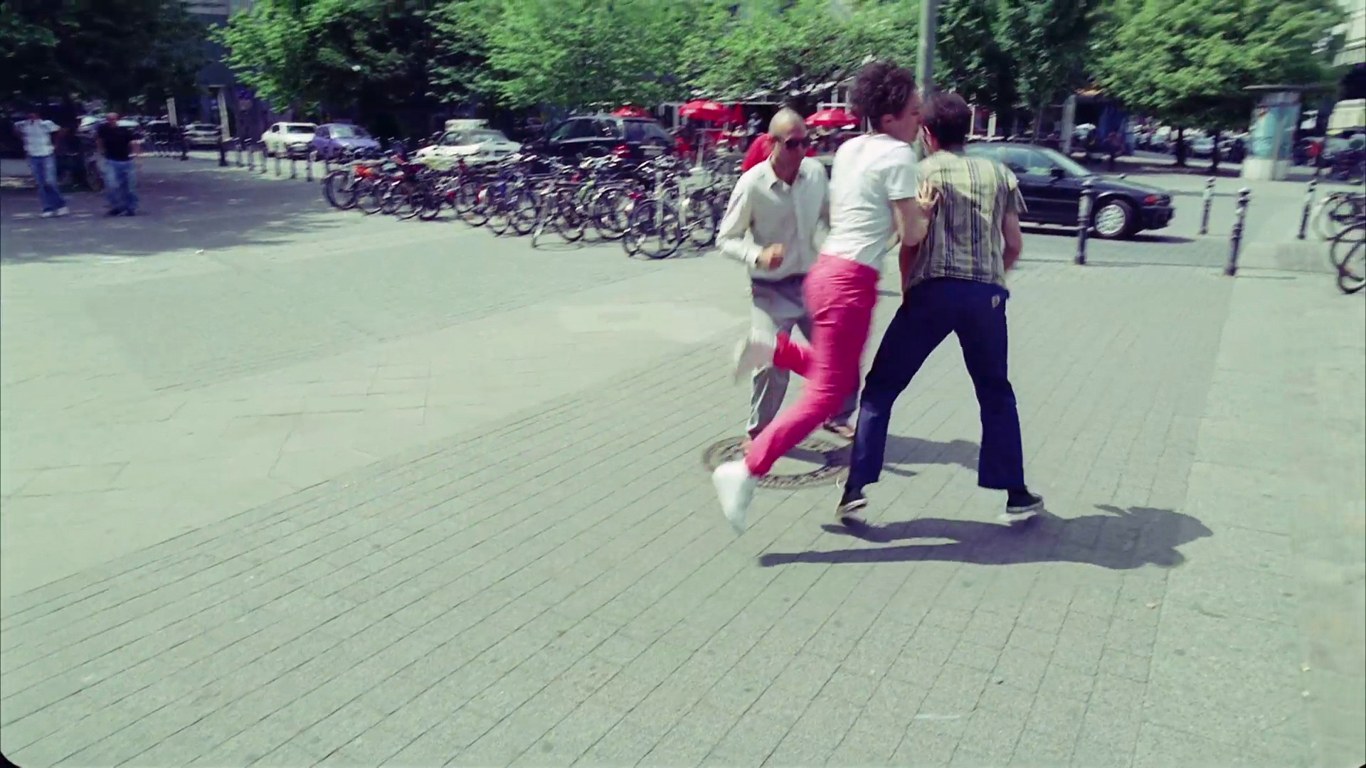 This short rhythmic moving image focuses on three people – the artist, a professional dancer, and a found performer – who encircle, rotate, jostle, intervene and interrupt each other. The action is located on a section of footpath in Berlin near an overpass, and they wear daytime clothing, recognisably contemporary, and a little bit ‘street’. The action was loosely based on a scene from the 1931 black and white Charlie Chaplin film City Lights, during a boxing match which appears like an elaborate dance, with the umpire moving between the boxers who throw circular like lobs at their opponents, confusion ensues and it isn’t clear who is fighting who, given that they seem to lose the purpose of their actions mid-fight. Frankovich turns this comedic satire of the most ferocious of sports into a strange interwoven movement between the three who stay continuously moving in a series of magnetic interactions and propulsions.