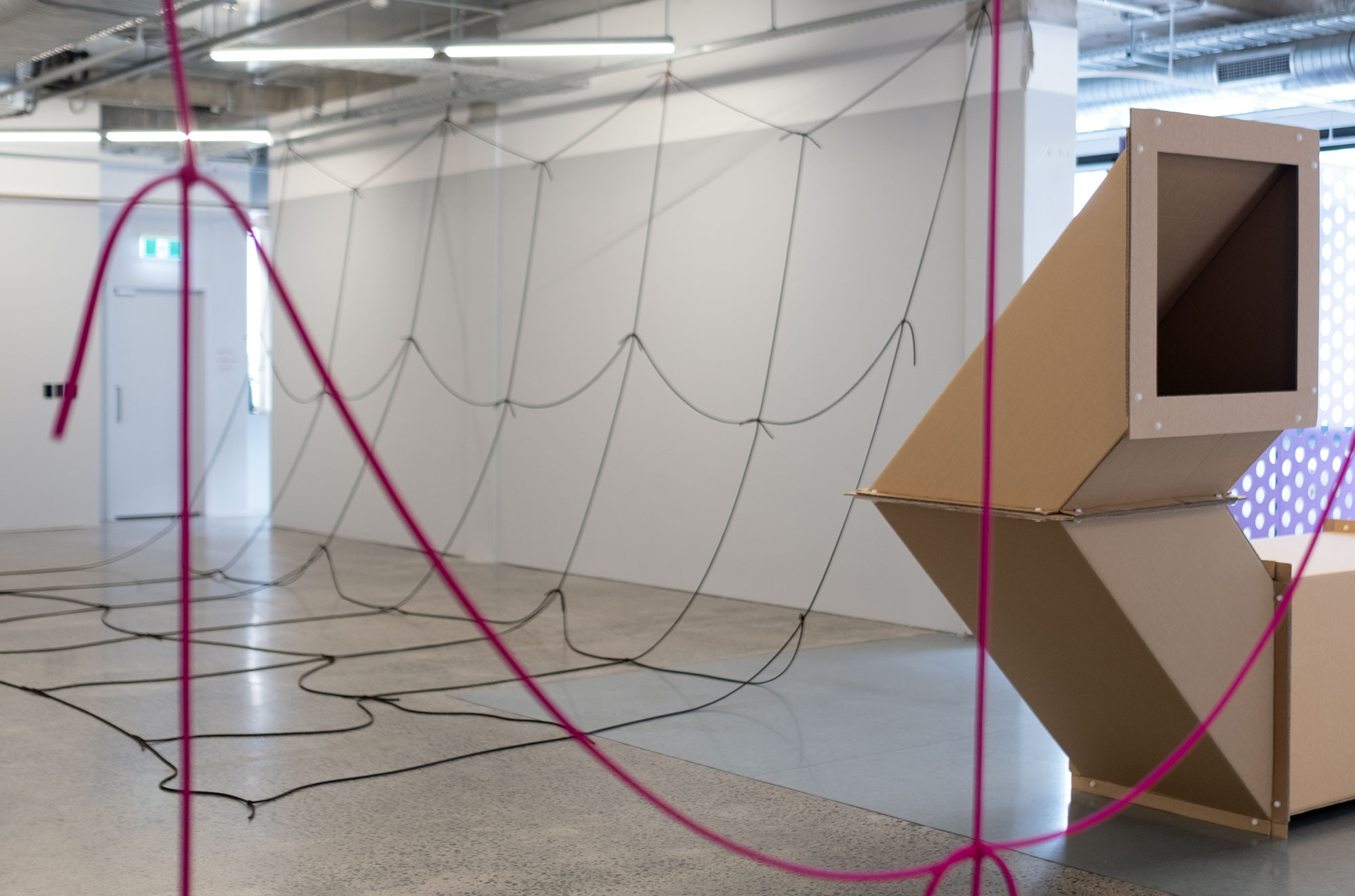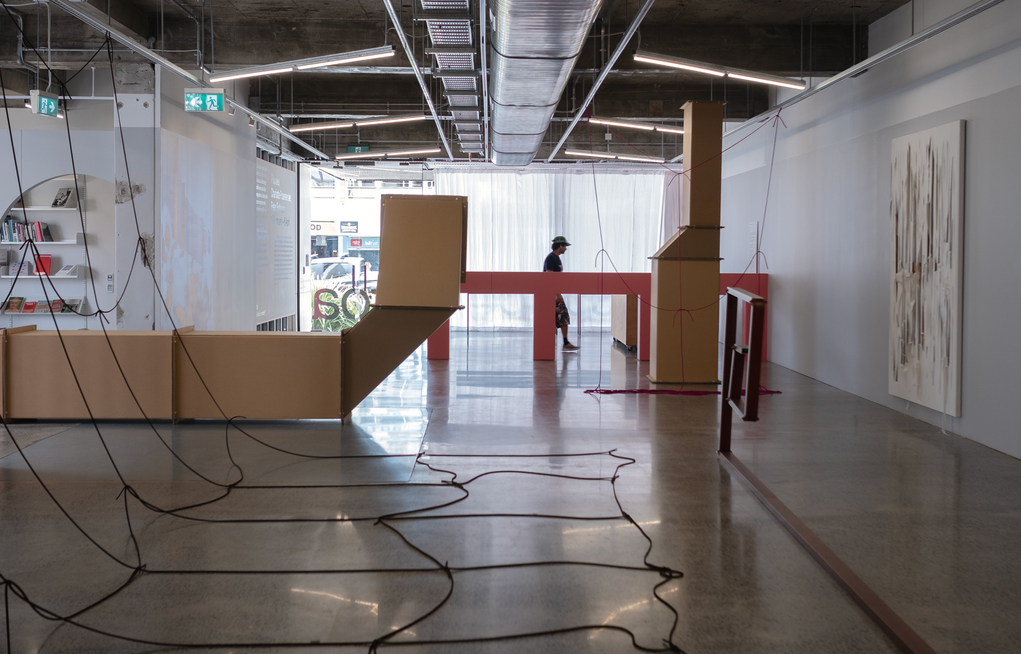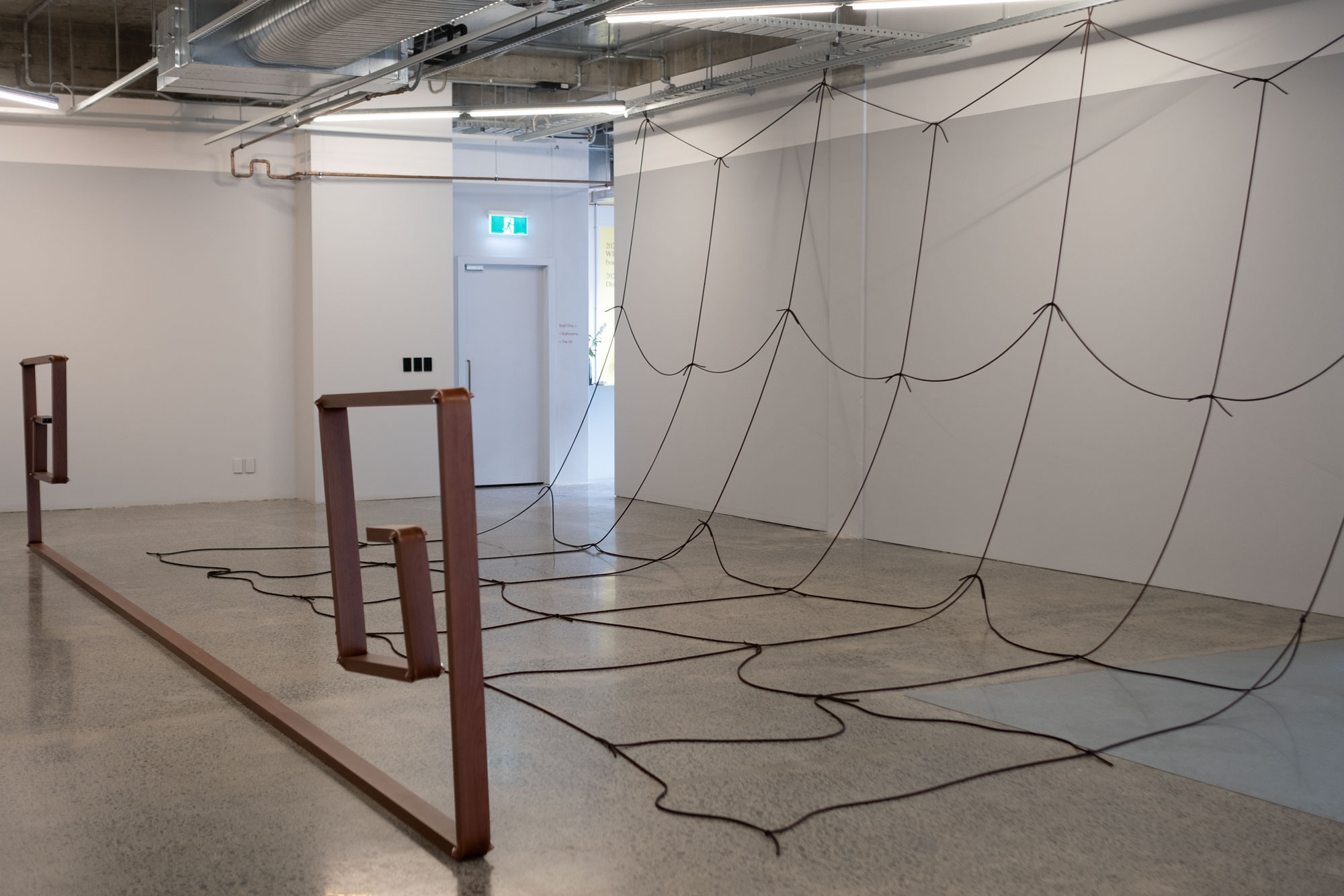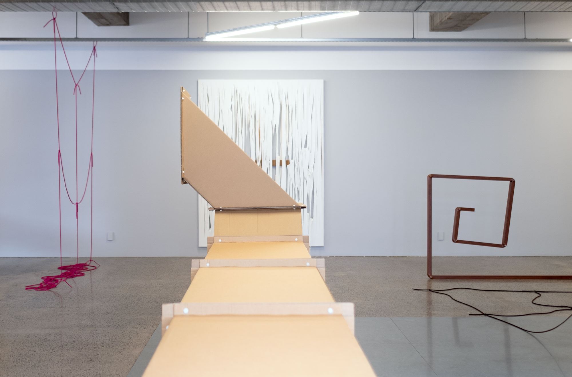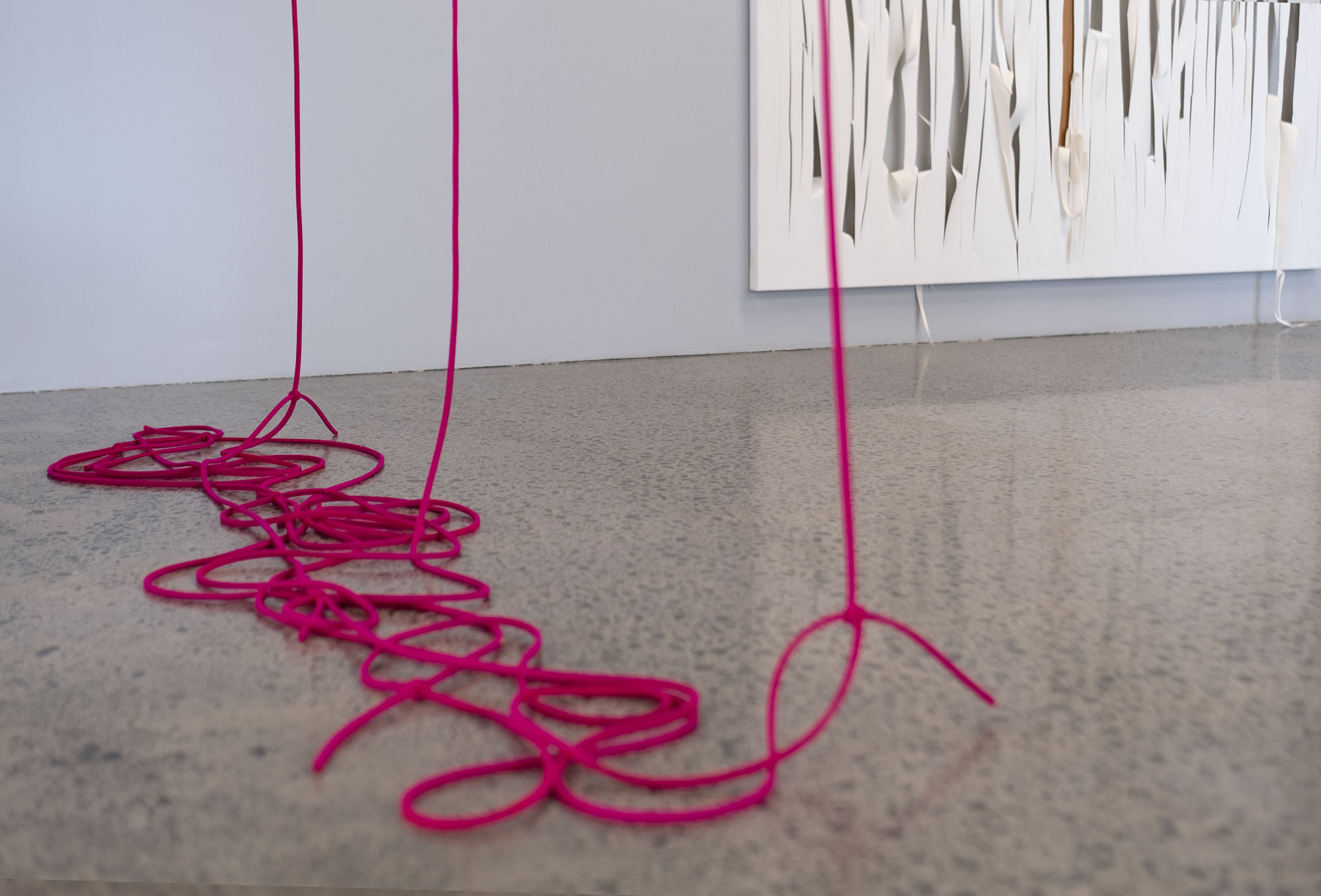 In this artworld-in-the-world we are invited to consider our bodies in relation to edges, where one thing ends and another begins. This activates the spatio-political quality of time with both artists tapping into this ambiguity: time as a monetizable measure, as an expressive singularity, as a language. Prior to engaging with visual art Posenenske trained in stage design and dramaturgy. This origin presents an interesting lens to review her decision to leave the artworld, while Robinson’s knotted grids require both positive and negative forces to stay together. Timing and tension can be everything: what is the best way to express the creative and political potential of the imagination? What is the best way to connect? For Posenenske the impulse to explore the potential of the imagination opened a door to another field, for Robinson it is an ongoing commitment to arts education and the exploration of the fundamental structures found in our world: the koru, the grid, the tear. This exhibition dives into form: waka, or tongues, or chimneys, or motorways, as well as the labour that it takes to produce all of this—our world in which we live together.