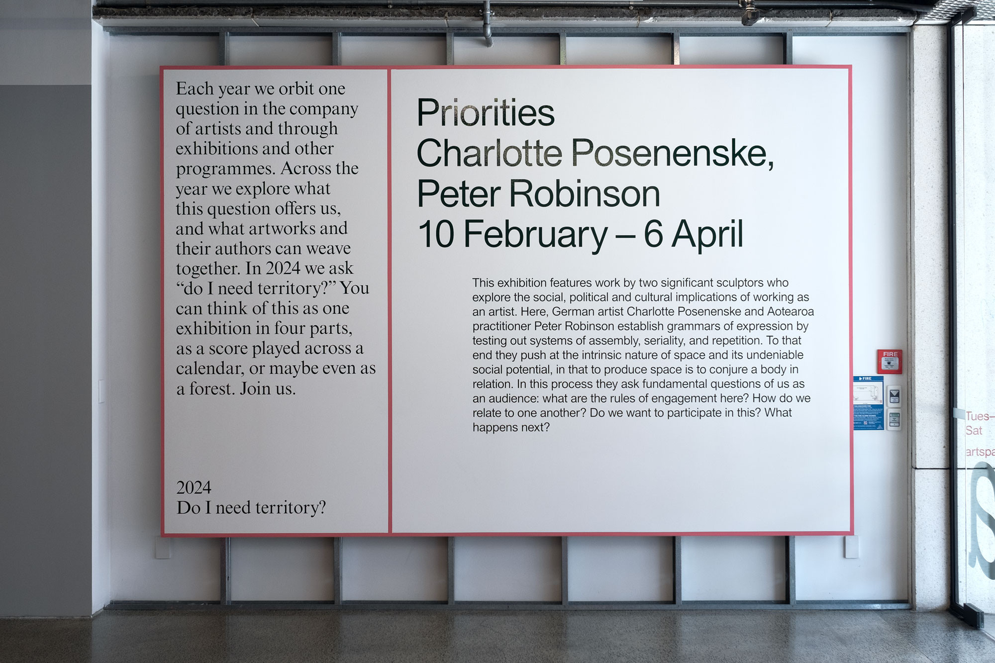 The work of seminal German artist Charlotte Posenenske and leading Aotearoa practitioner Peter Robinson establish grammars of expression by testing out systems of assembly, seriality, and repetition. To that end they push at the intrinsic nature of space and its undeniably social potential, in that to produce space is to conjure a body in relation. In this process they ask fundamental questions of us as an audience: what are the rules of engagement here? How do we relate to one another? Do we want to participate in this? What happens next?