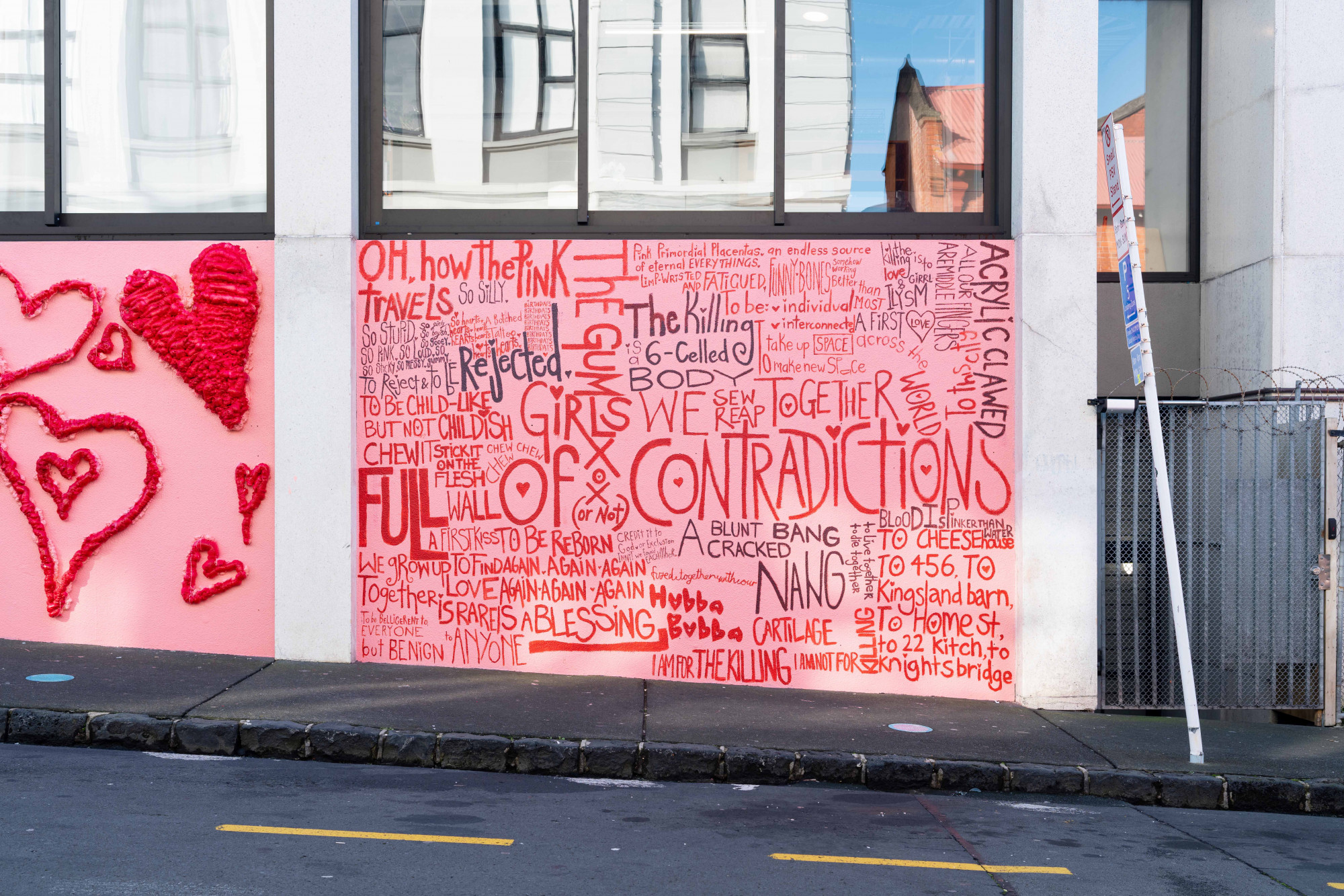 Artspace Aotearoa is proud to present ILYSM by The Killing as our third mural project since our relocation to the ground level on Karangahape Road. Responding to the T junction of Karangahape Road and East Street in Newton, the mural project reflects the dynamism of this historically layered place, whilst staying attuned to the intent of making new histories with those who have a socio-political responsibility to its future.