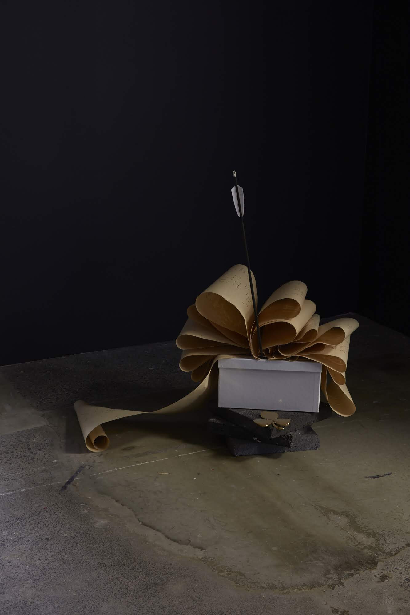 - Even Though You Give Me A Growling, I’ll Be Waiting In Your Wings, Ake Tonu Atu (detail), Tyson Campbell, new materilaism, pond-cage, Tapu Ngāpuhi mud, piano script, witch stop stolen from Ponsonby mansion, Ralph Hotere inspired laser, decorative red ribbon, gift box, unfired seemingly apolitical clay, treaty-esque ink, egg shells to reference fragility, hickory horse bow and arrow, 2018.