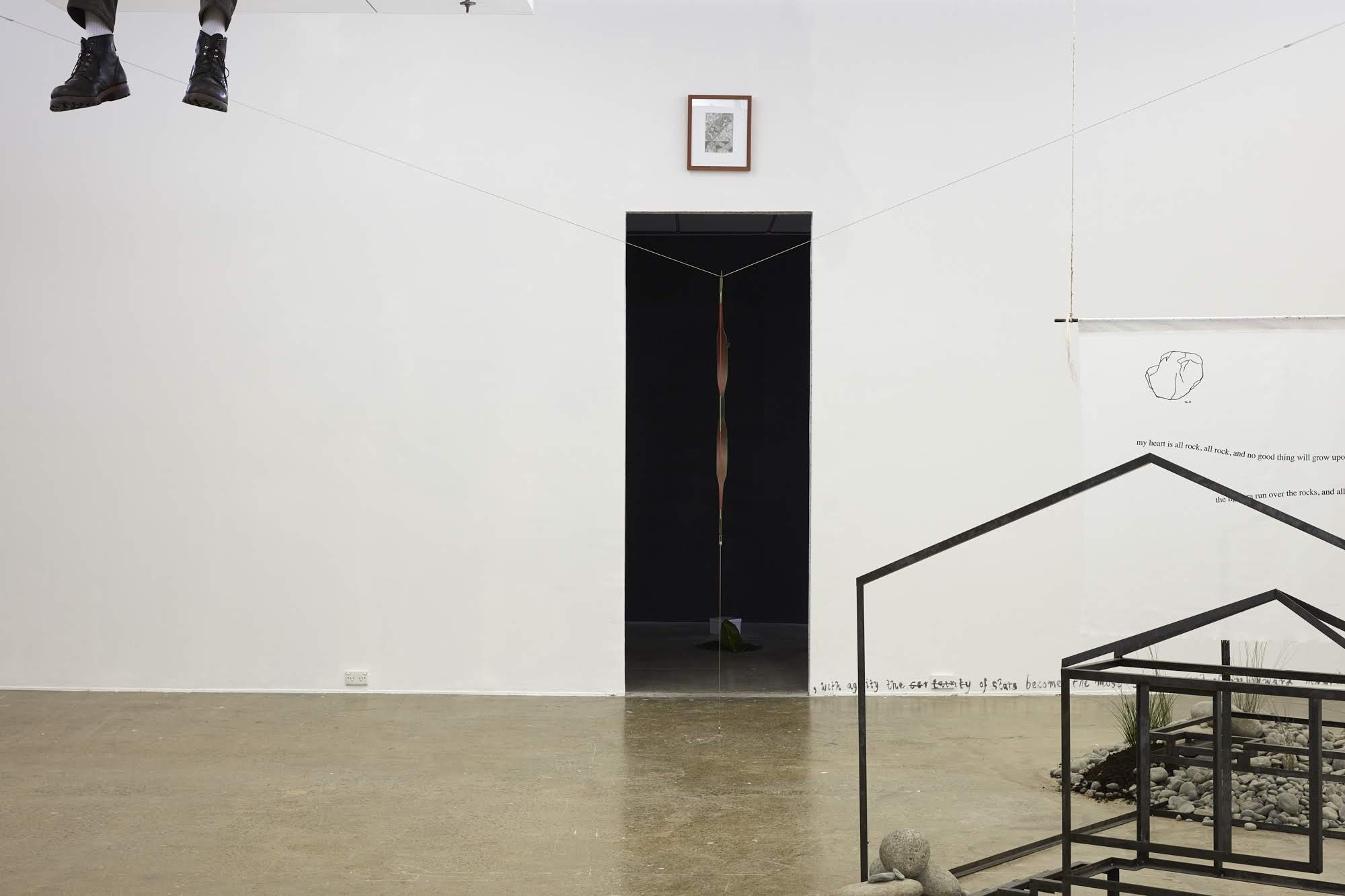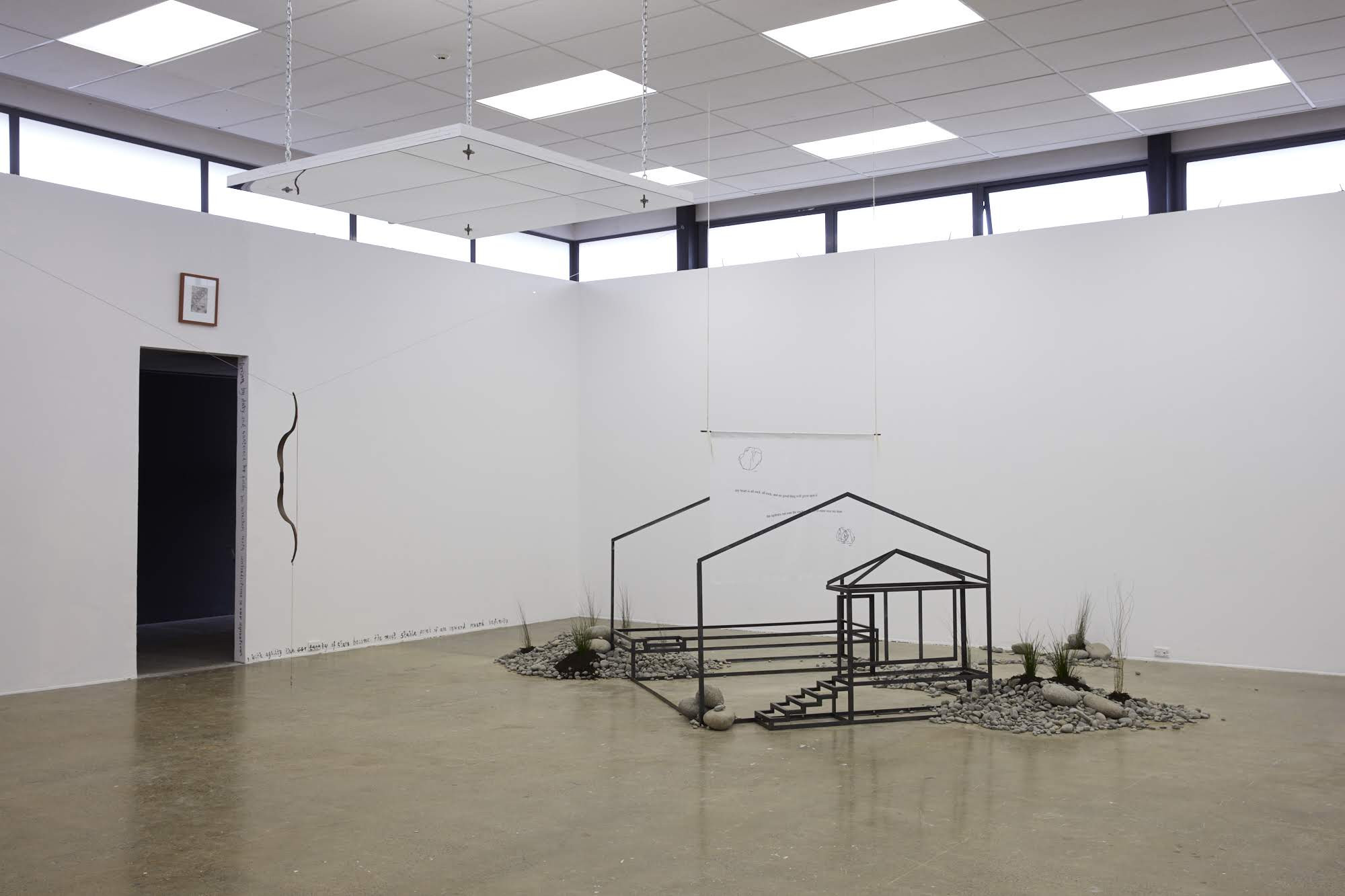 - A Desire for Elsewhere, Bronte Perry, mild steel, river rock, oioi, carex, muka, soil, linen, 2018.