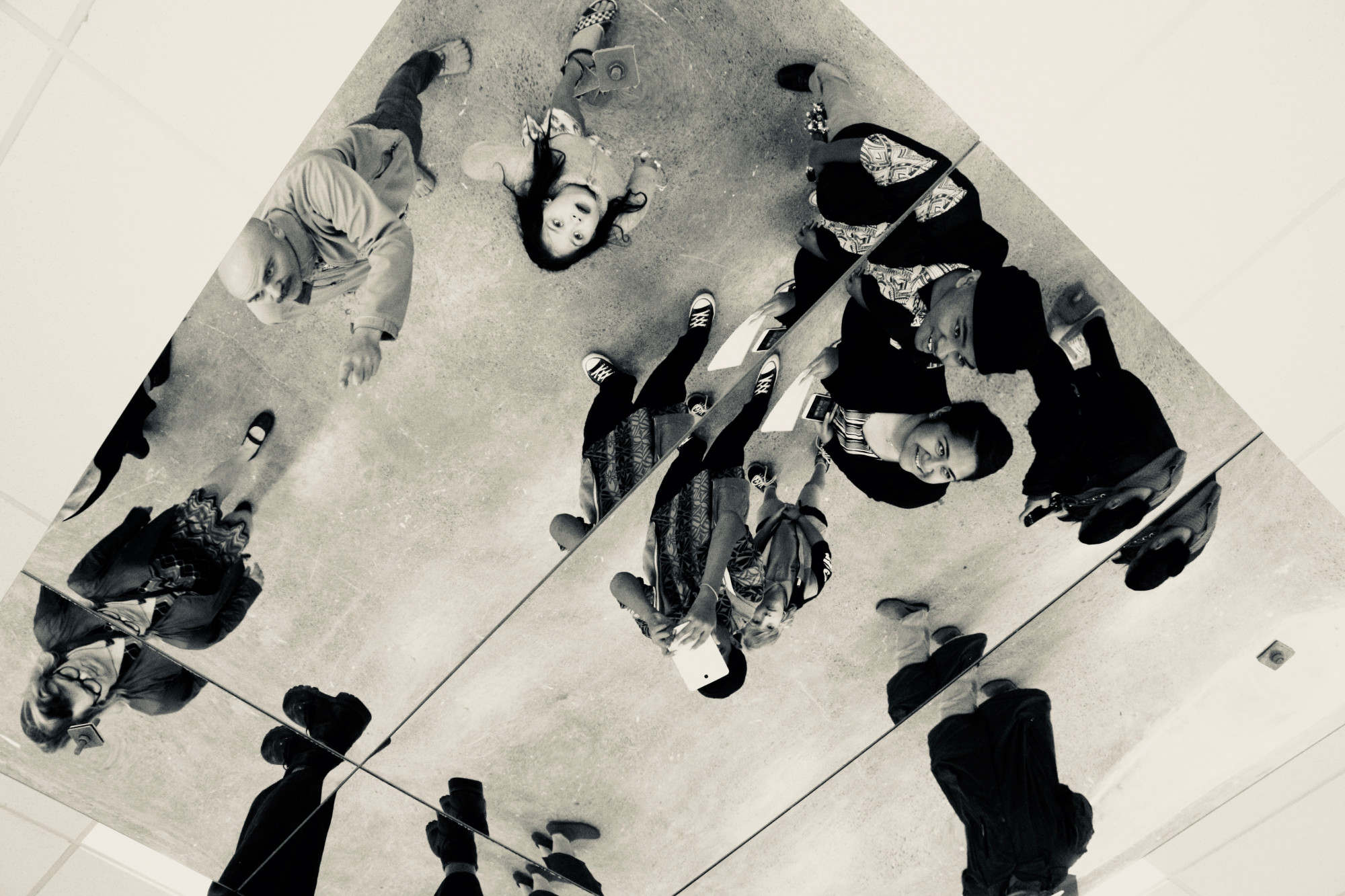 8(i). Breeding Negotiations: Assessment Criteria for Potential Opportunities (detail of performer Tane van Traa), Olyvia Hong, colander, ceiling fan propellers, wood, chains, mirrored perspex, 2018.