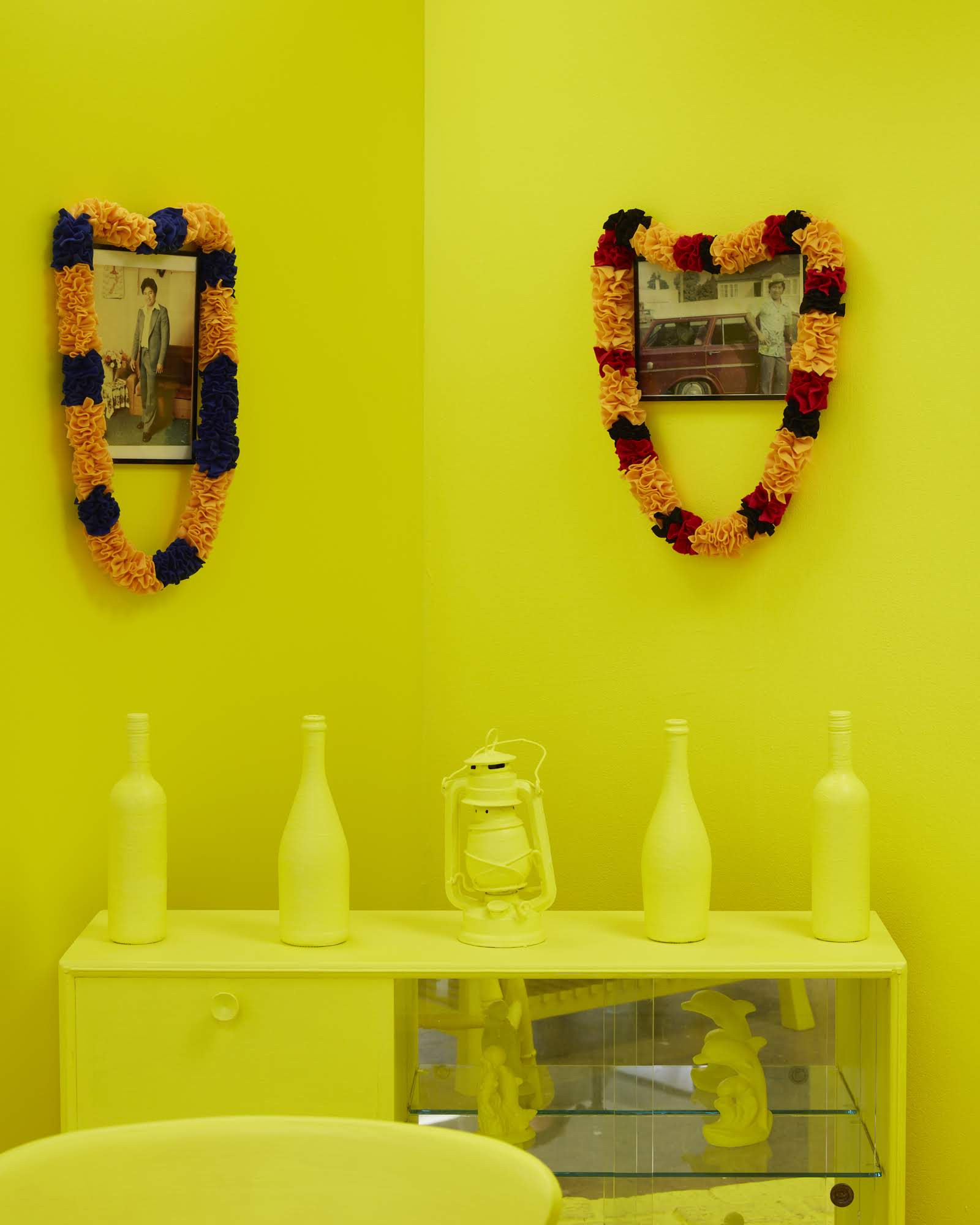 - The Yellow Brick Road Home (detail), Faamele Etuale, household items, bricks, felt lei, and old family photos, 2018.