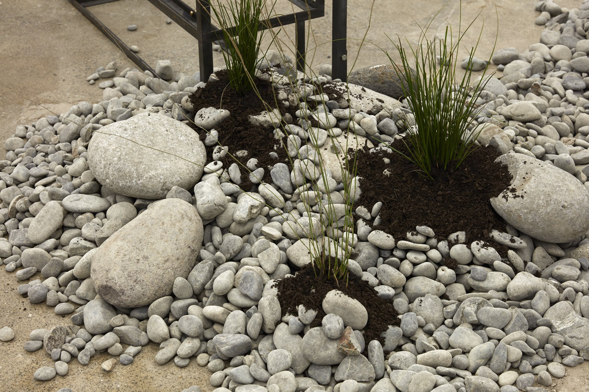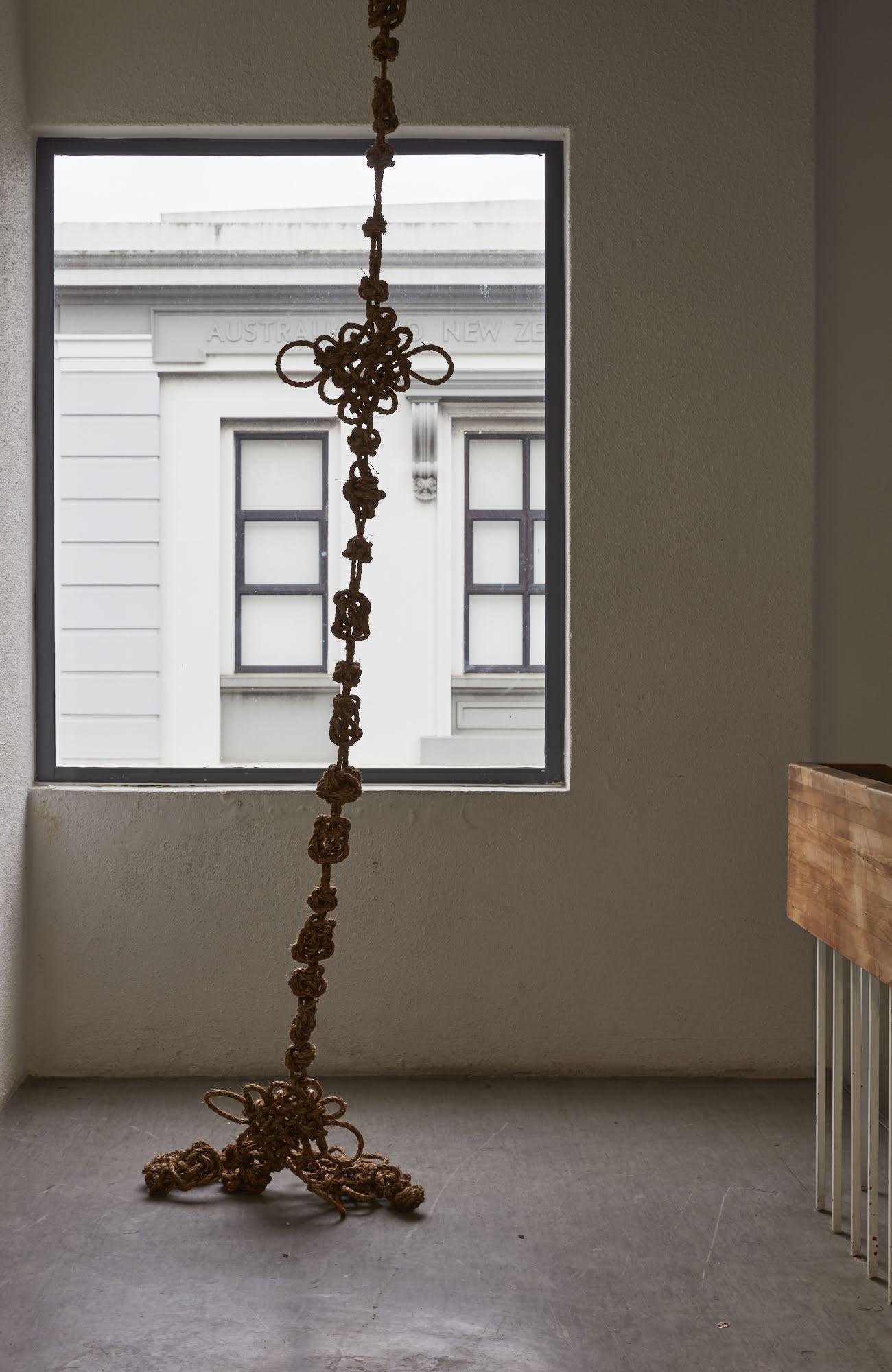 - A Desire for Elsewhere (detail), Bronte Perry, mild steel, river rock, oioi, carex, muka, soil, linen, 2018.