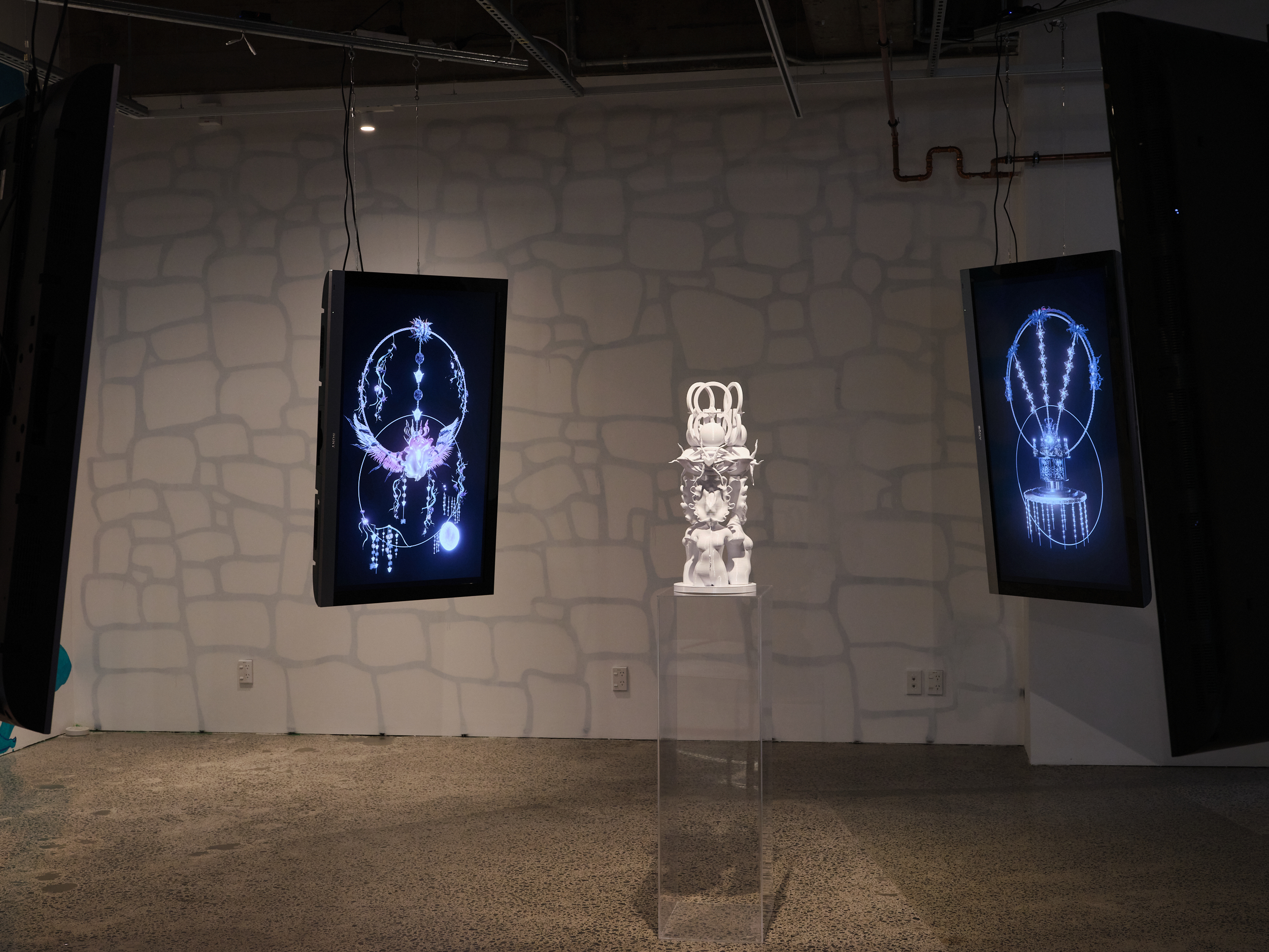 Thus, in Ritual of Subject's live installation, four digital video works The Anti-Enjoyment Mentality of Abstinence, The Grotesque of Consumer Symbols, The Flattering of Physical Changes and The Idol Worship of Cynic are shown on four TV screens, together surrounding the 3D sculpture Aggregate of Desires in the middle of the scene, forming an encircling field. For me, the four videos are an expression of my subjectivity, while the 3D sculpture Aggregate of Desires, which is enclosed in the middle of the scene, has a power of externalisation and reconstruction through its physical presentation. I call this - a 'ritual' of the scene of desire. The whole installation responds to my 'desecration' and 'craving' for the object, but also involves the re-exploration and reconstruction of the subject, allowing me to gradually form a new individual narrative within this 'ritual'.